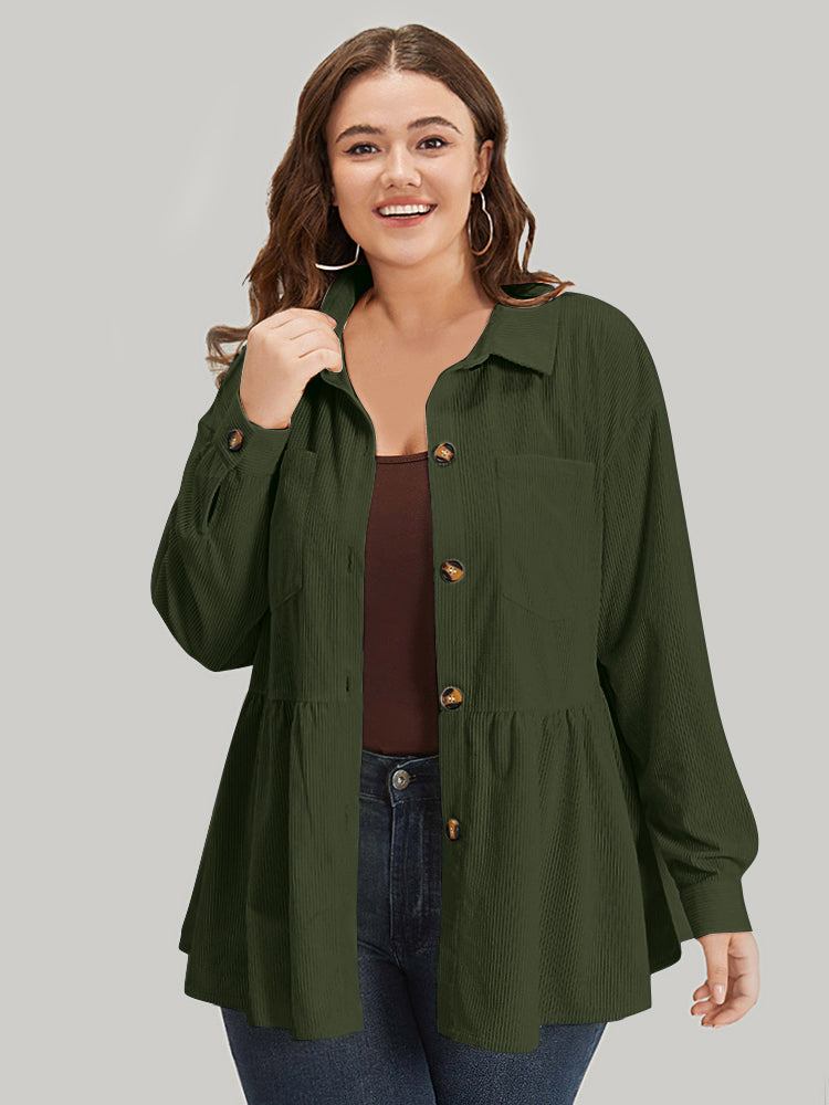 Plain Shirt Collar Button Through Ruffle Hem Pocket Coat