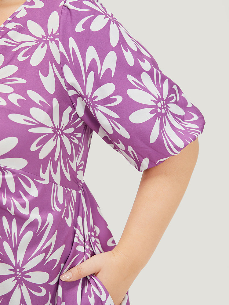 Floral Print Puff Sleeve Pocket Twist Front Dress