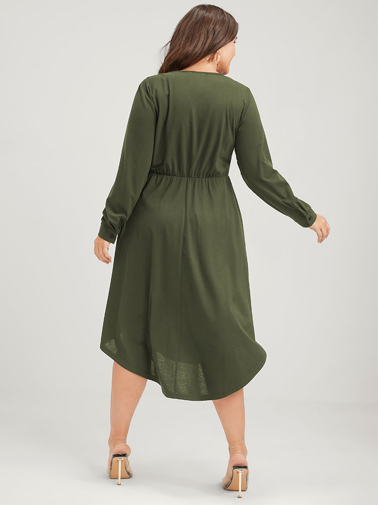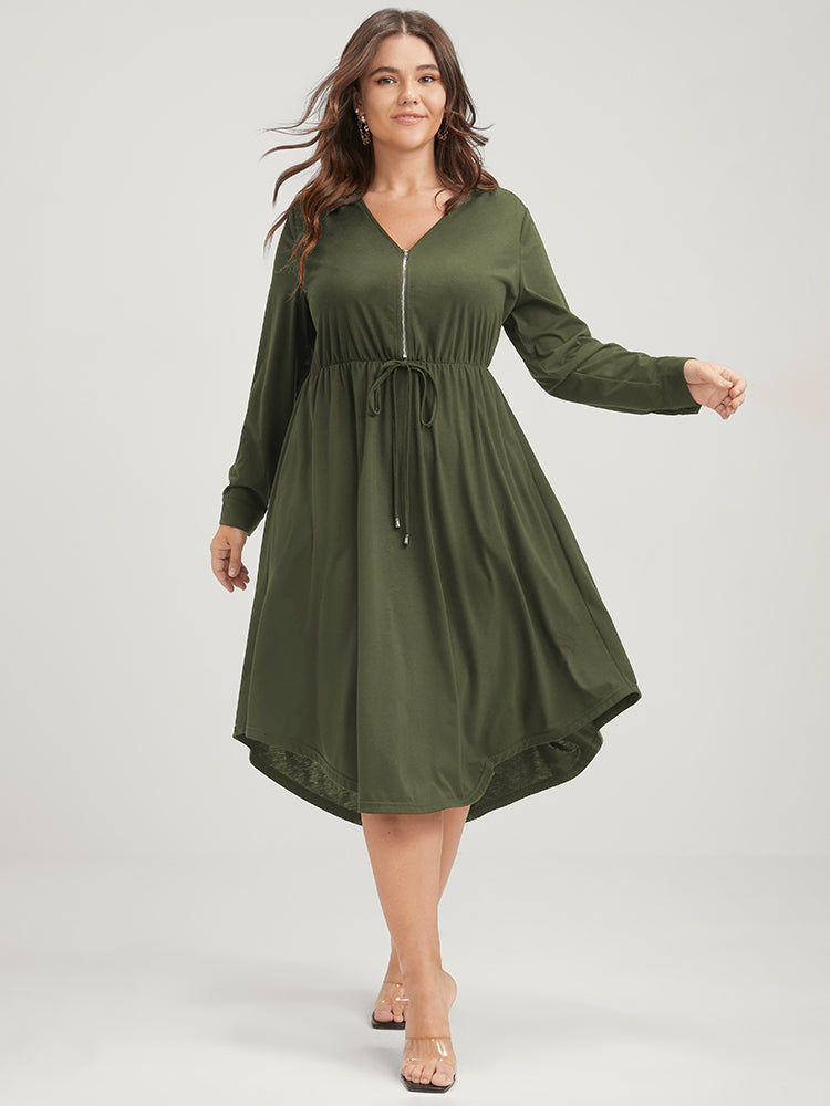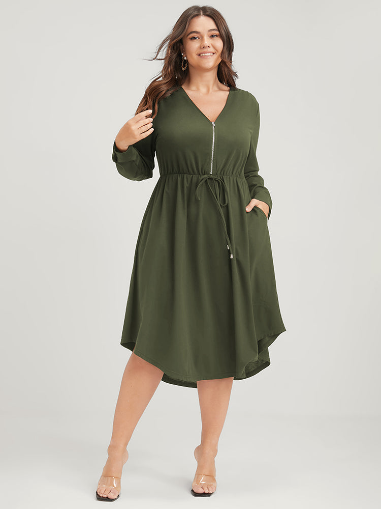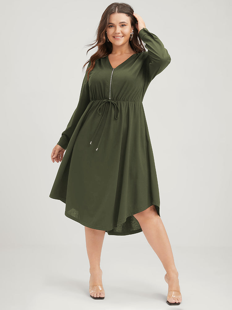 Solid Zipper Pocket Flutter Drawstring Asymmetrical Hem Dress