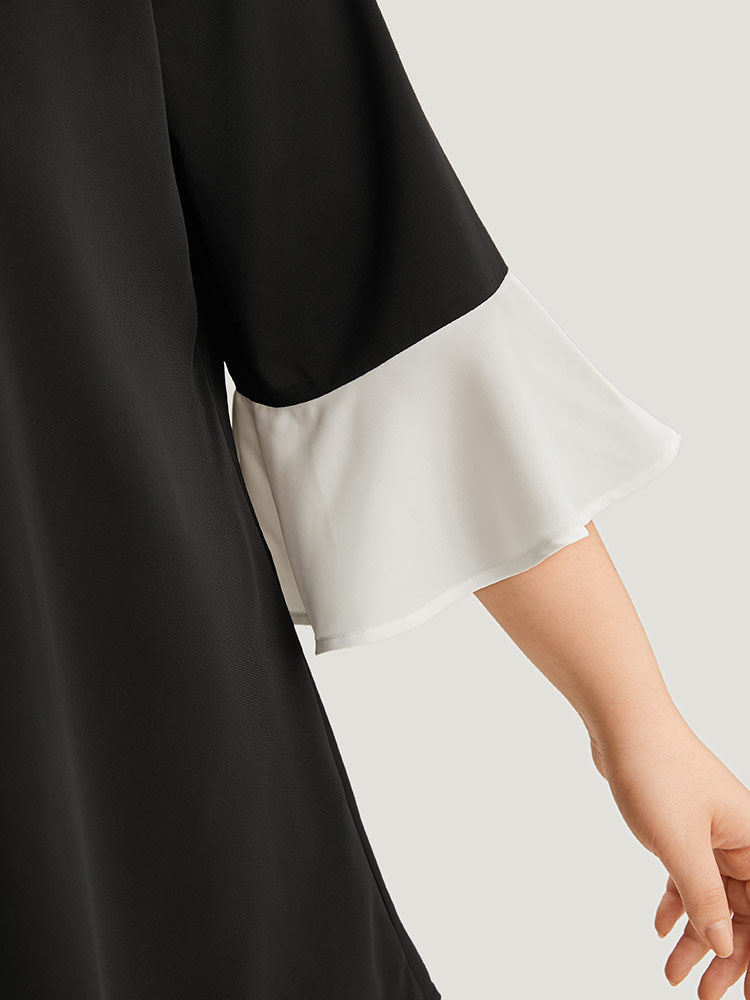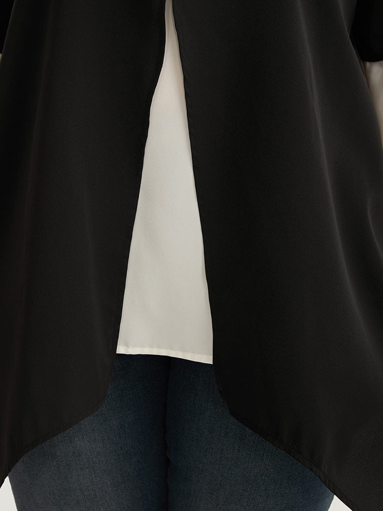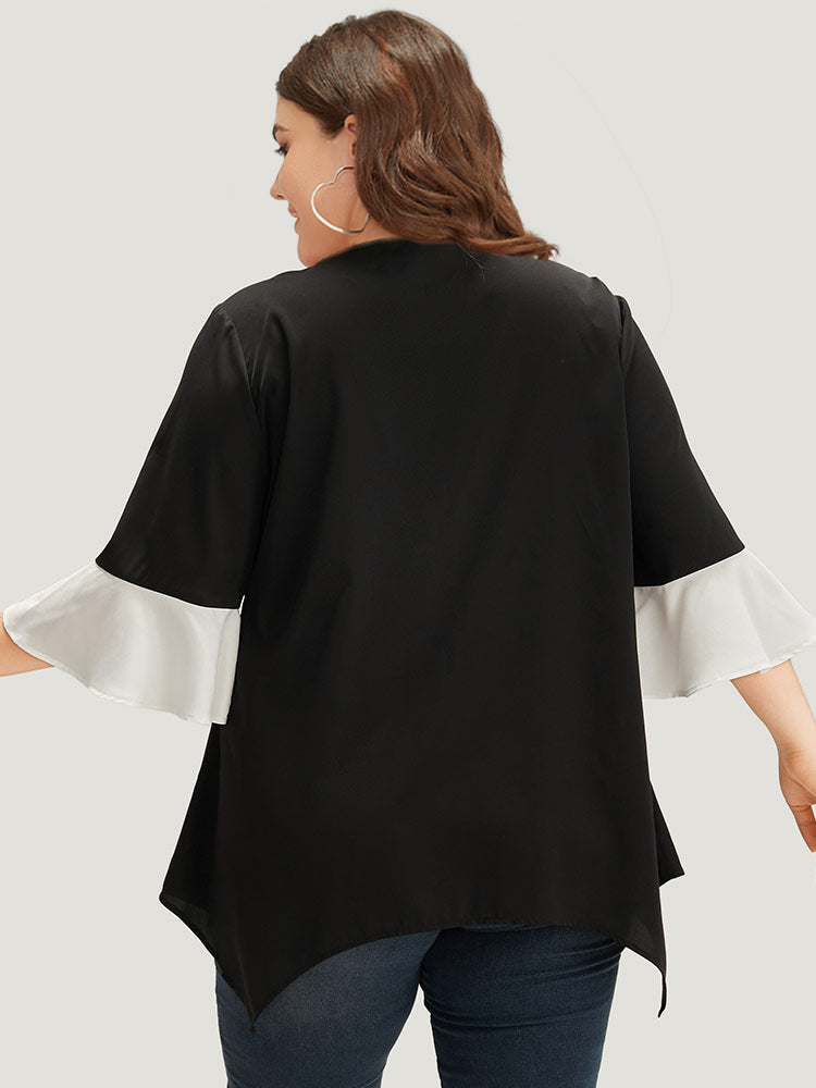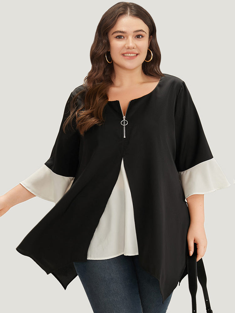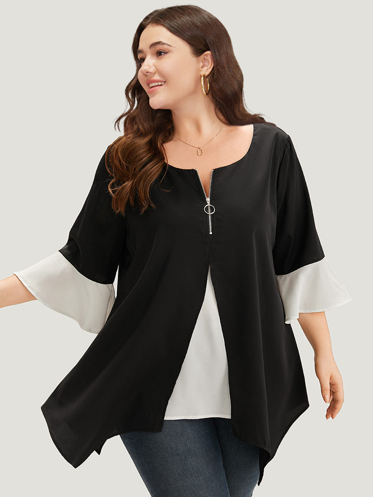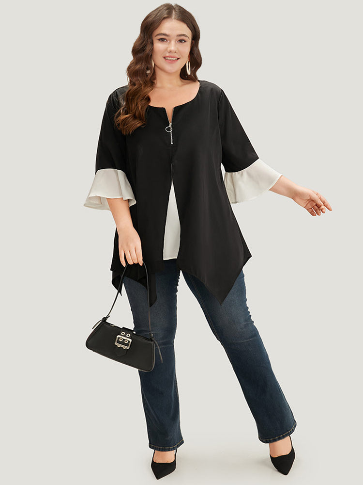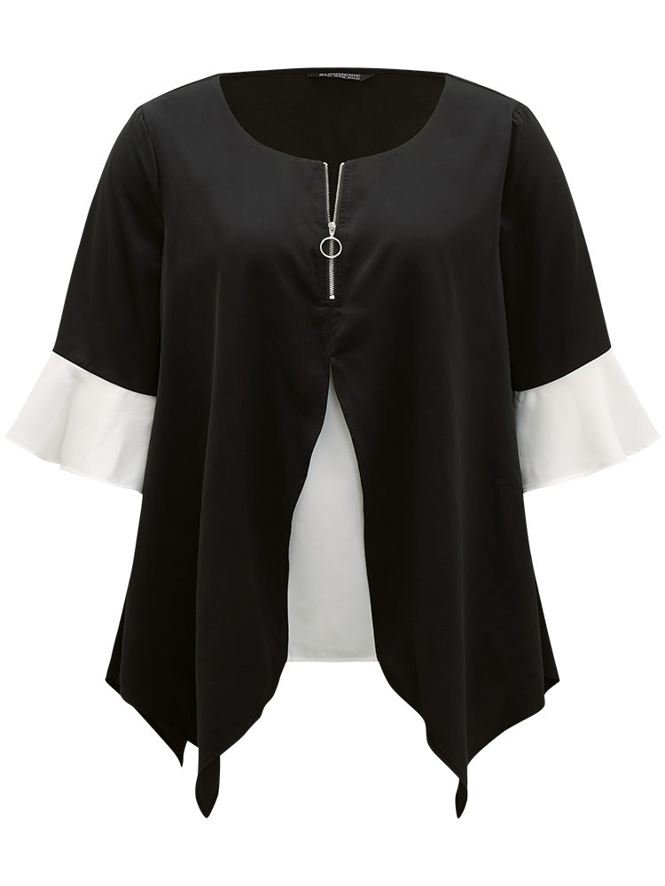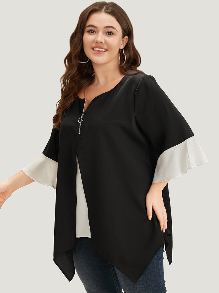 Anti-Wrinkle Contrast Zip Up Flutter Sleeve Hanky Hem Blouse