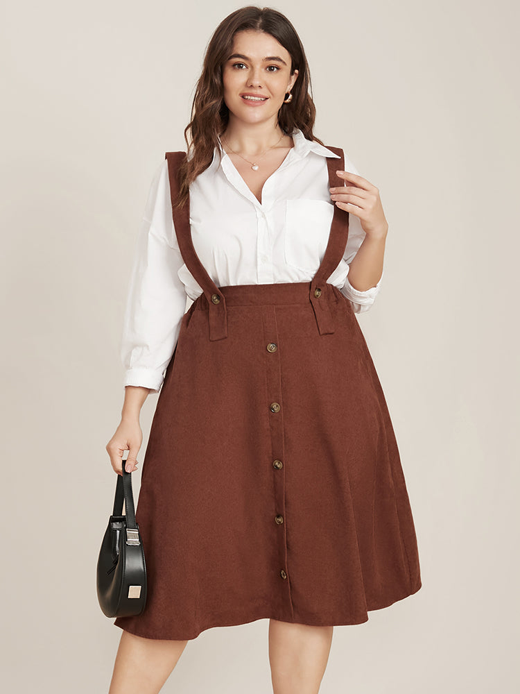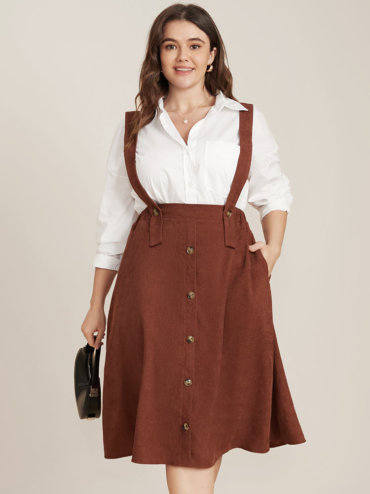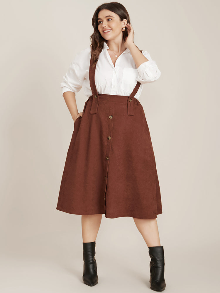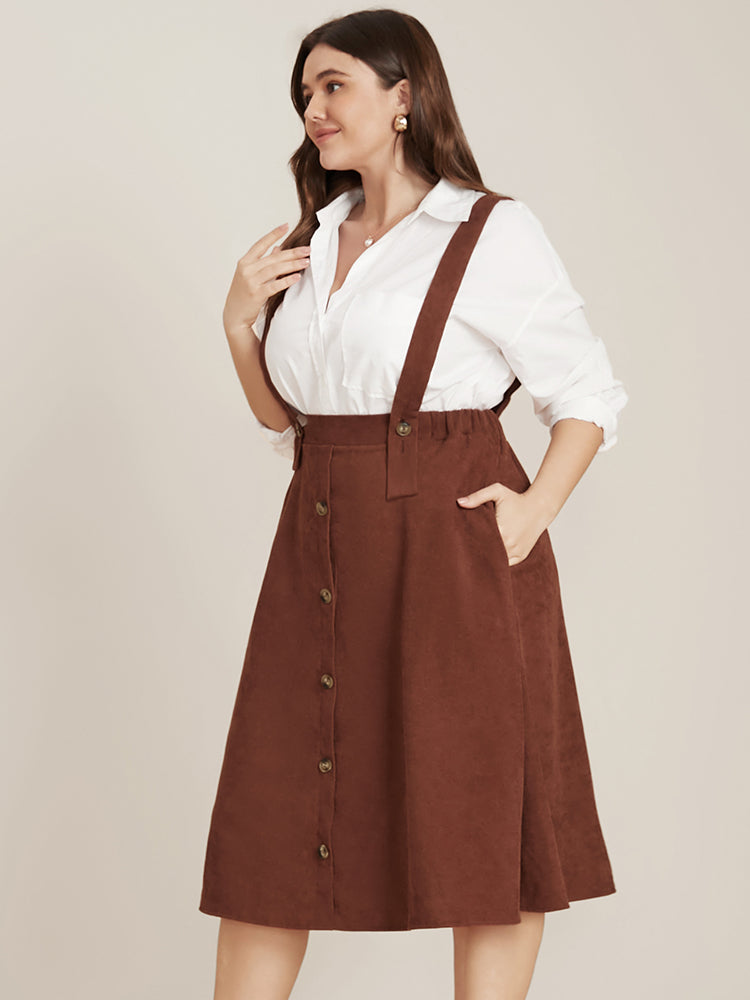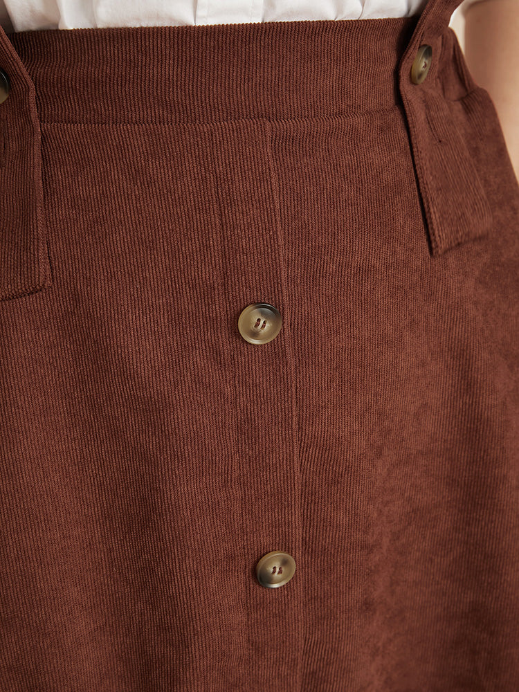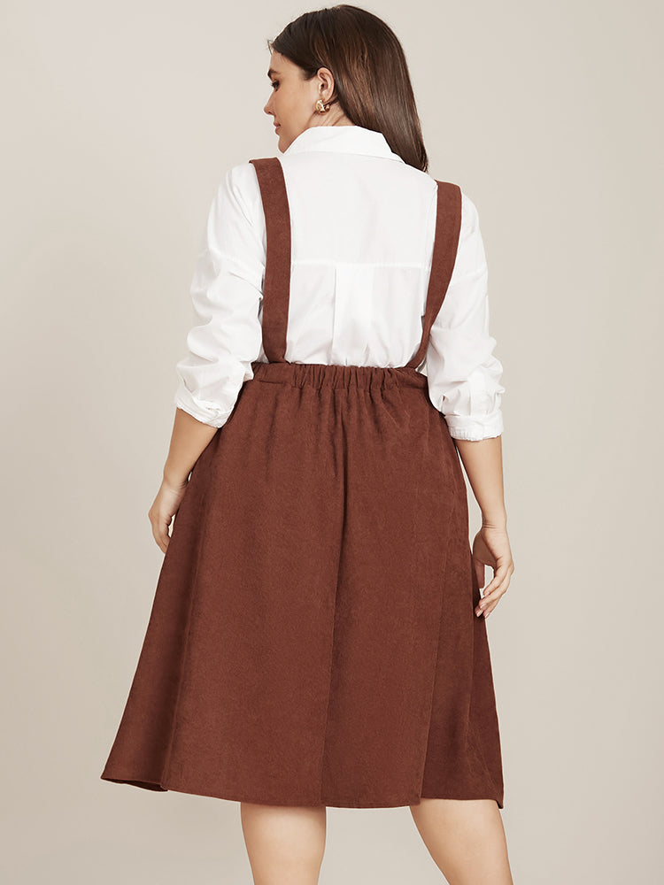 Solid Button Detail Pocket Corduroy Suspender Skirt