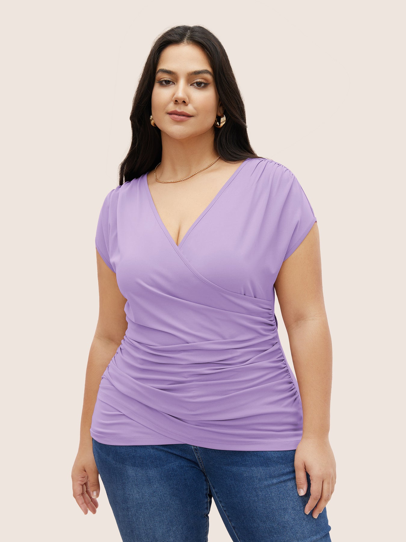 Plain Ruched Overlap Collar Dolman Sleeve Knit Top
