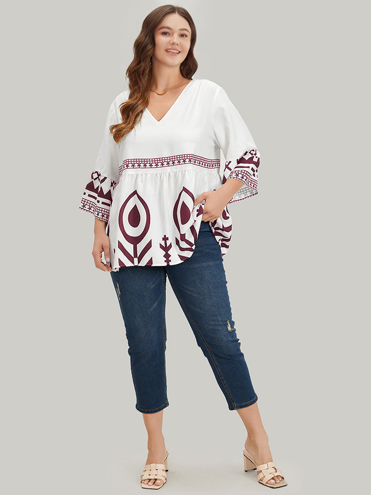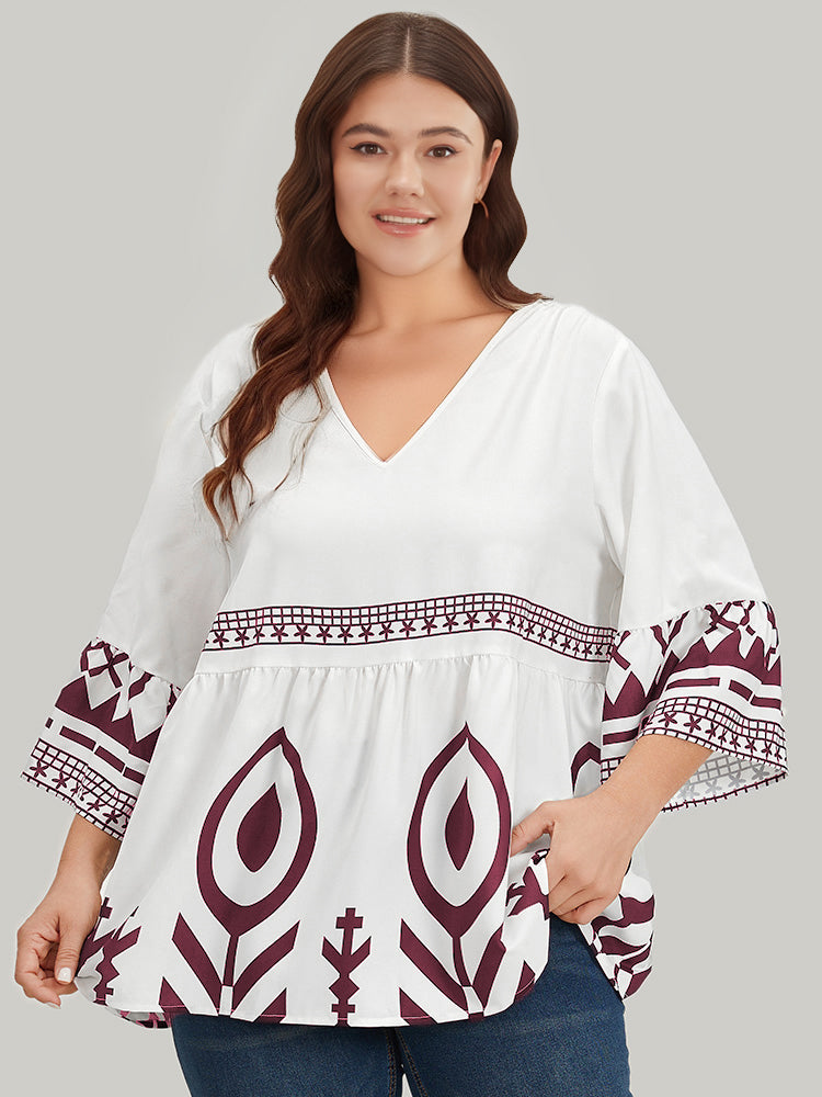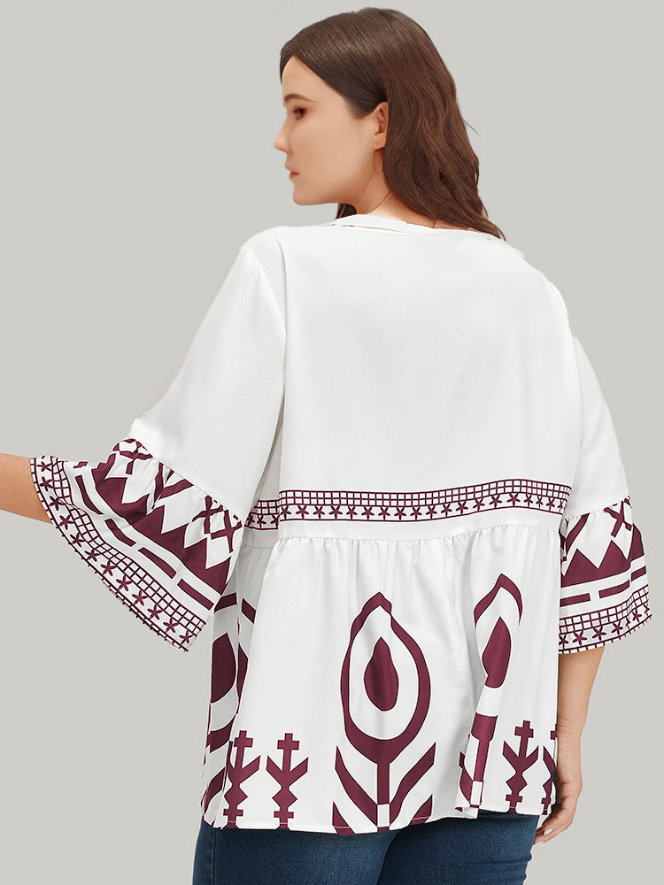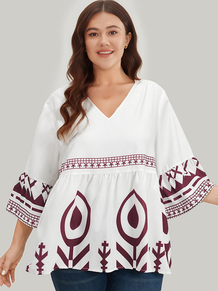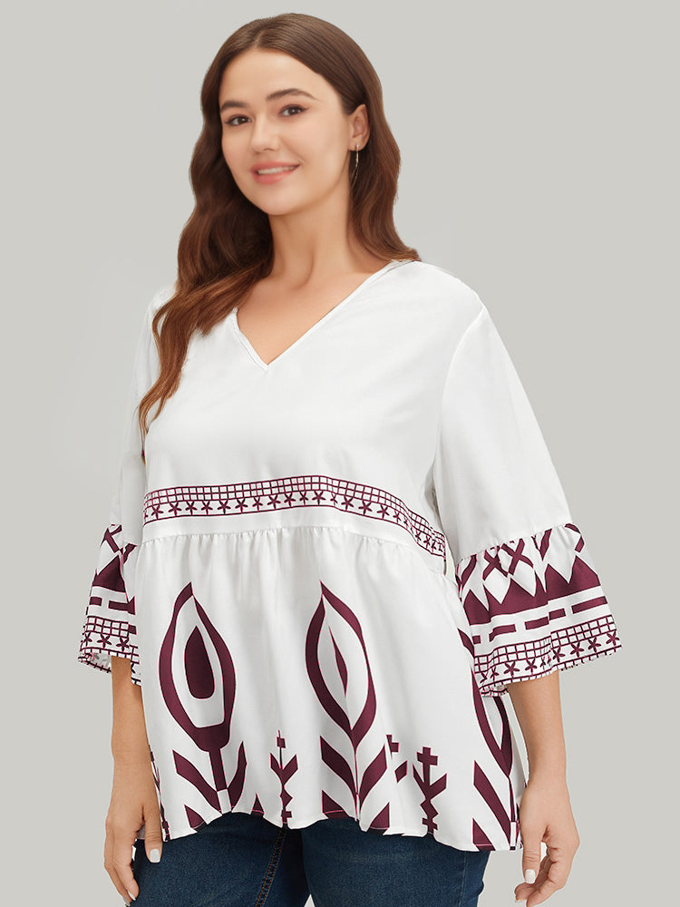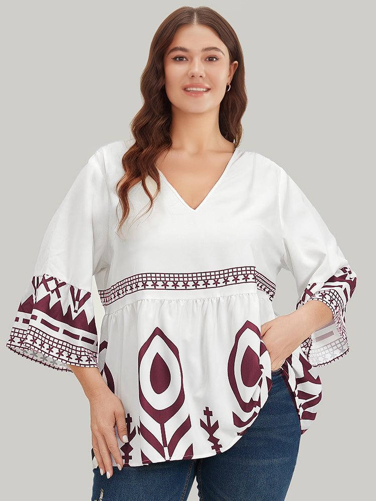 Silhouette Floral Print Bell Sleeve Ruffle Hem Blouse