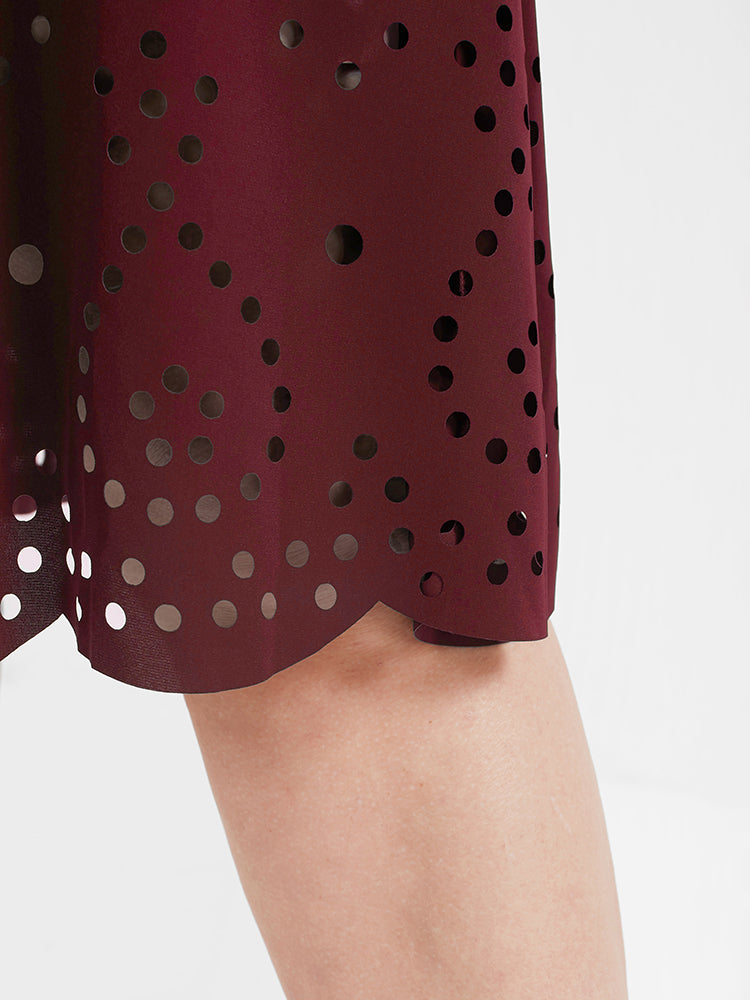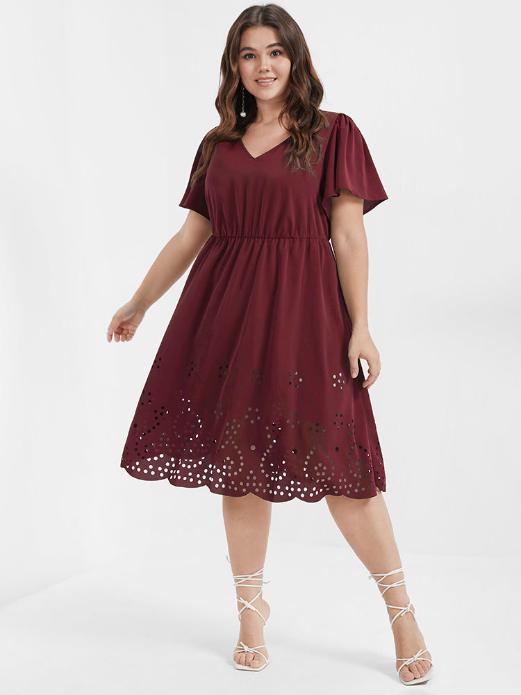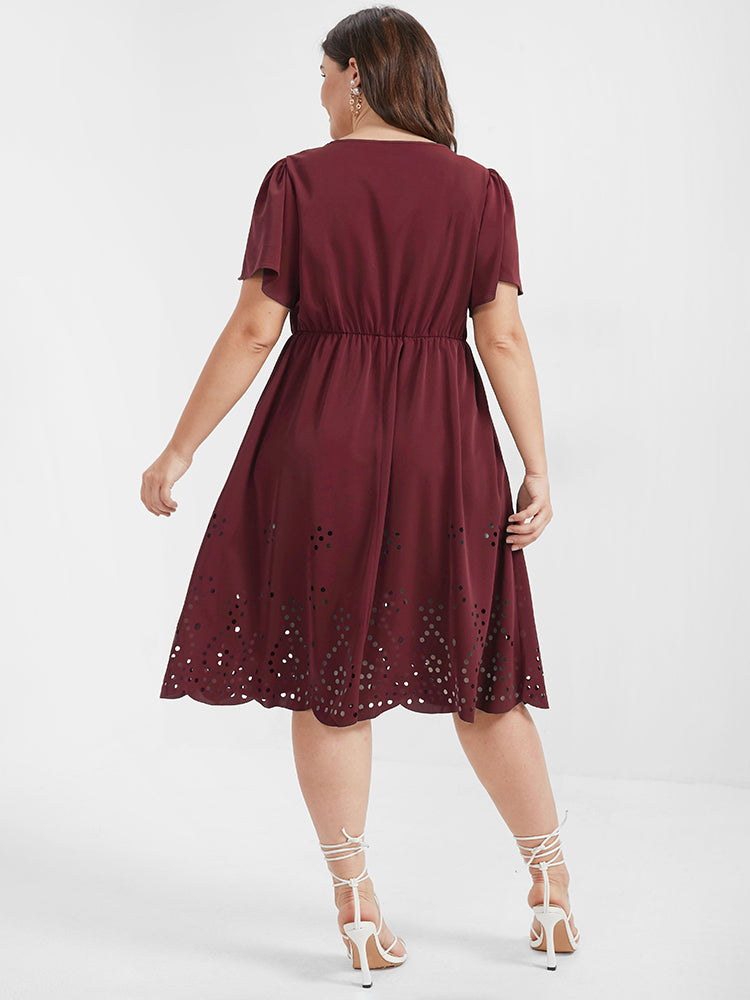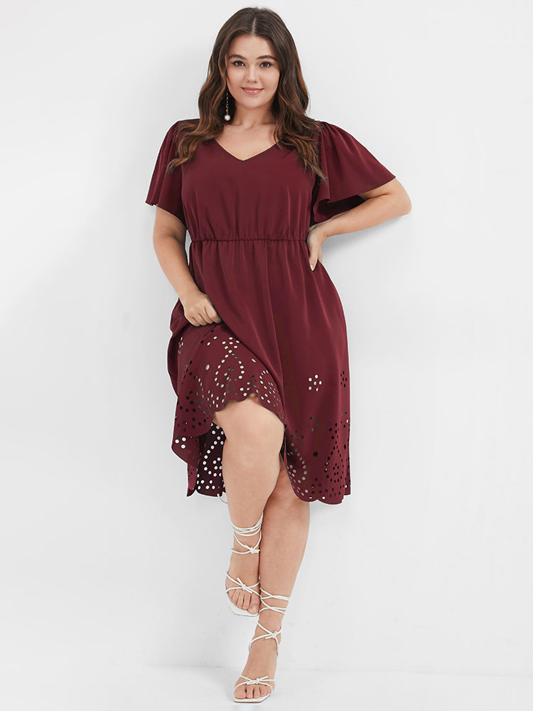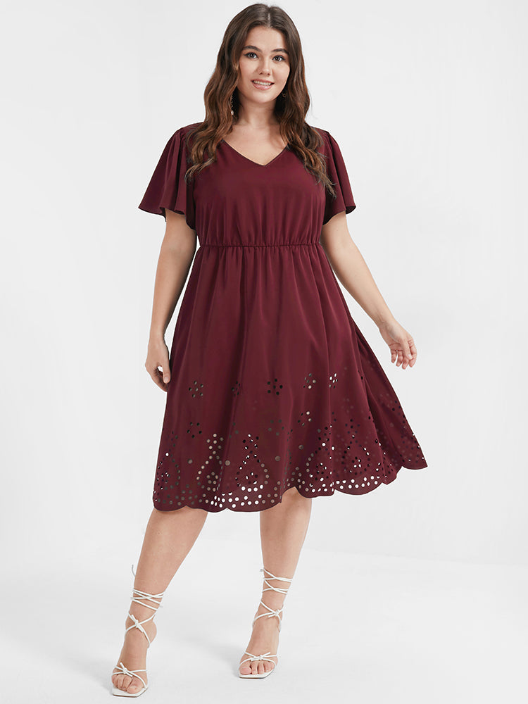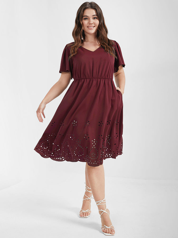 Solid Ruffles Pocket Broderie Anglaise Knee Dress