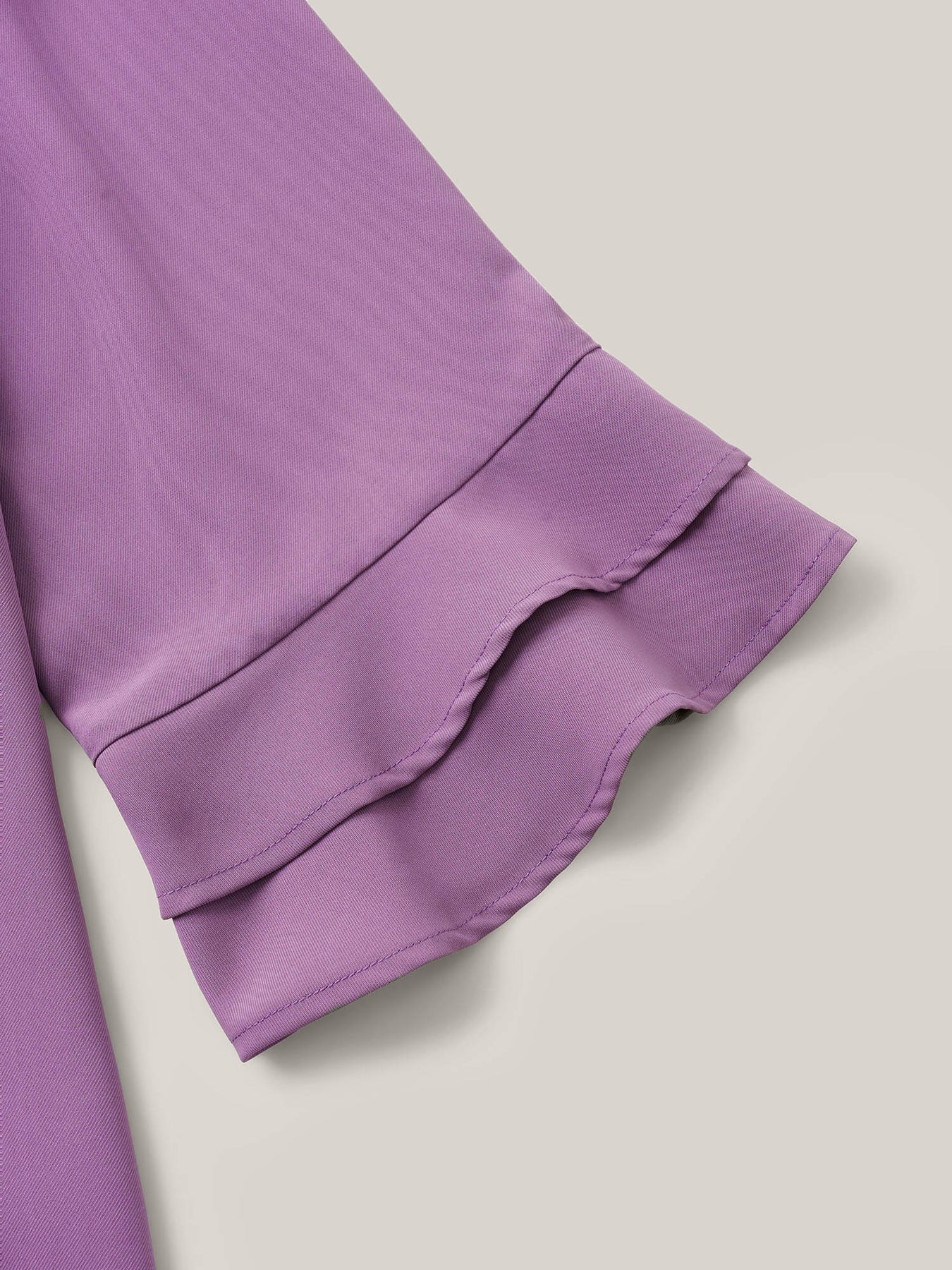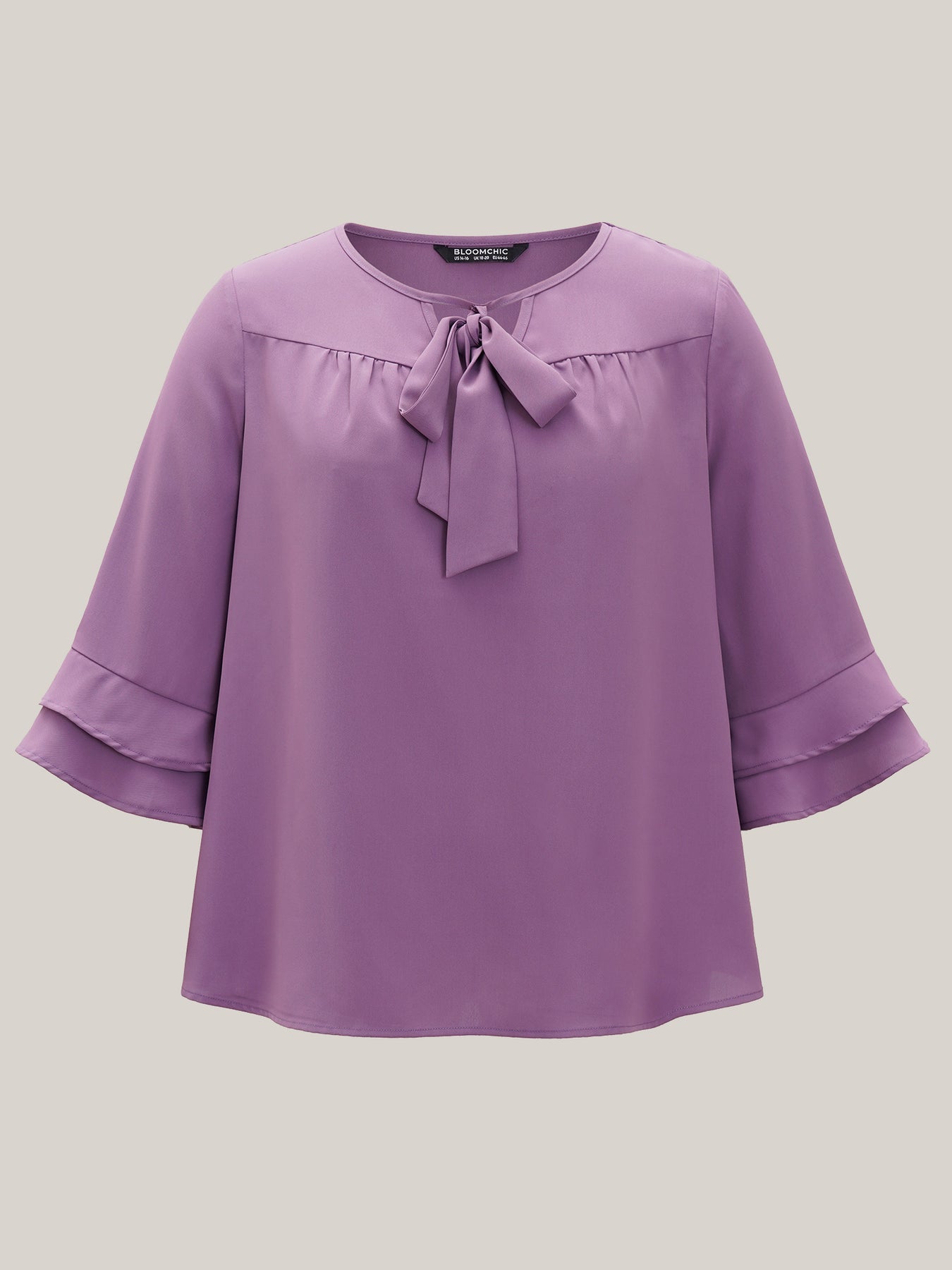 Solid Ribbon Tied Collar Bell Sleeve Blouse
