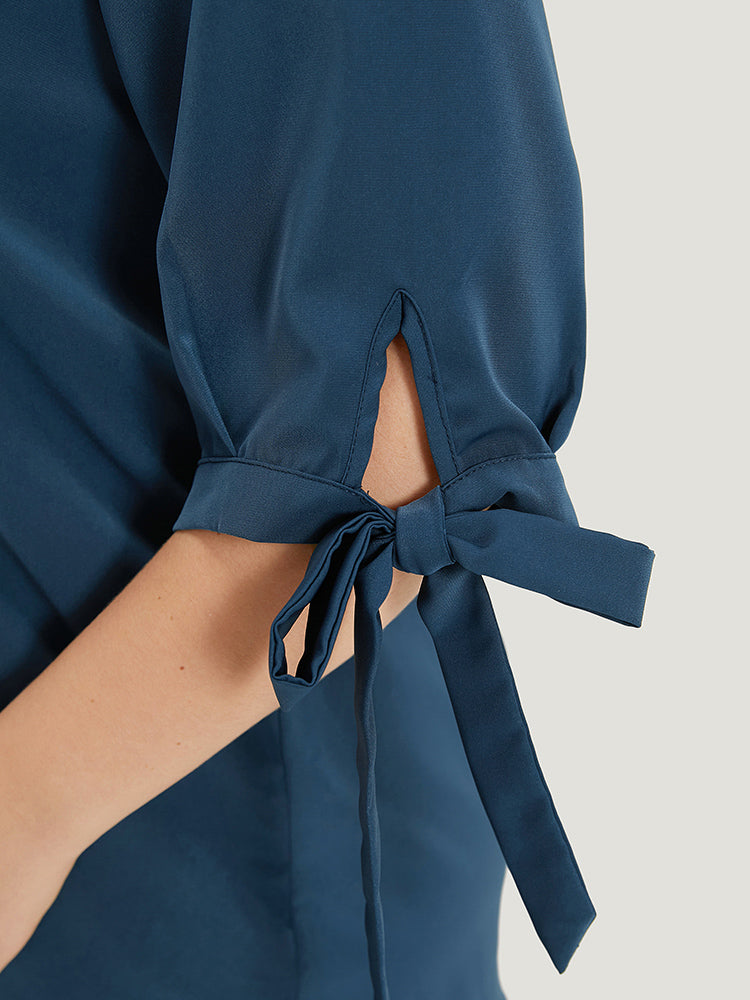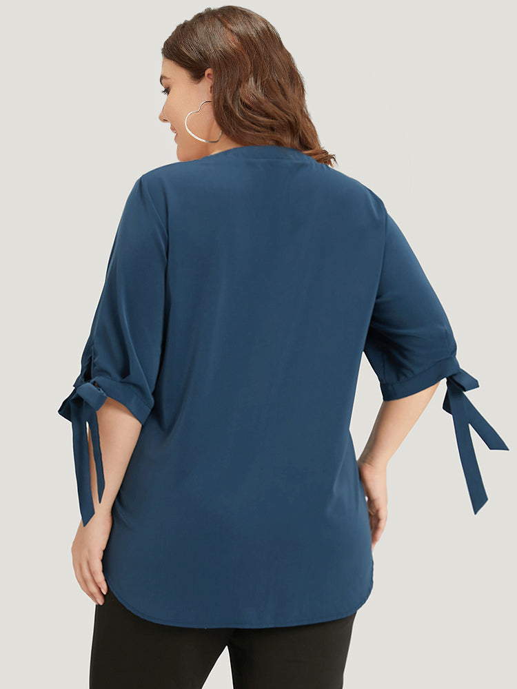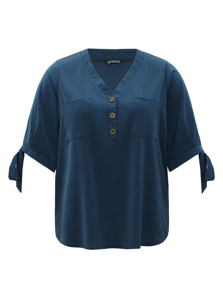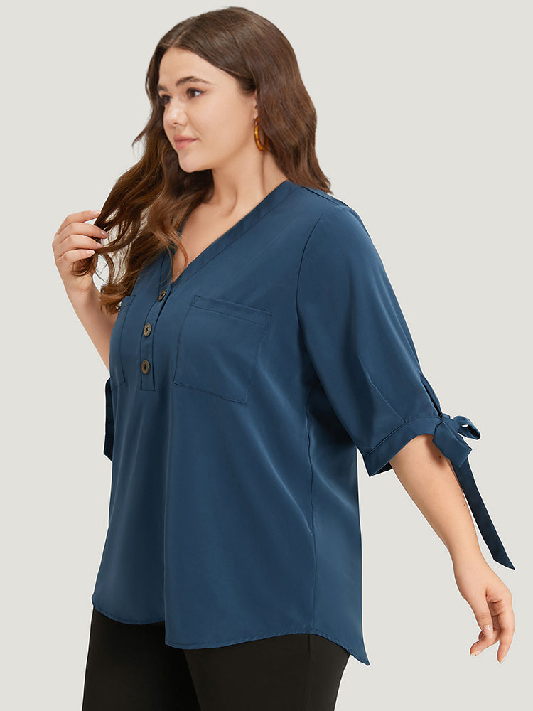 Anti-Wrinkle Plain Button Up Knot V Neck Pocket Blouse