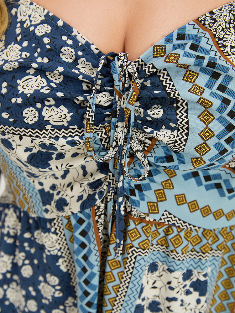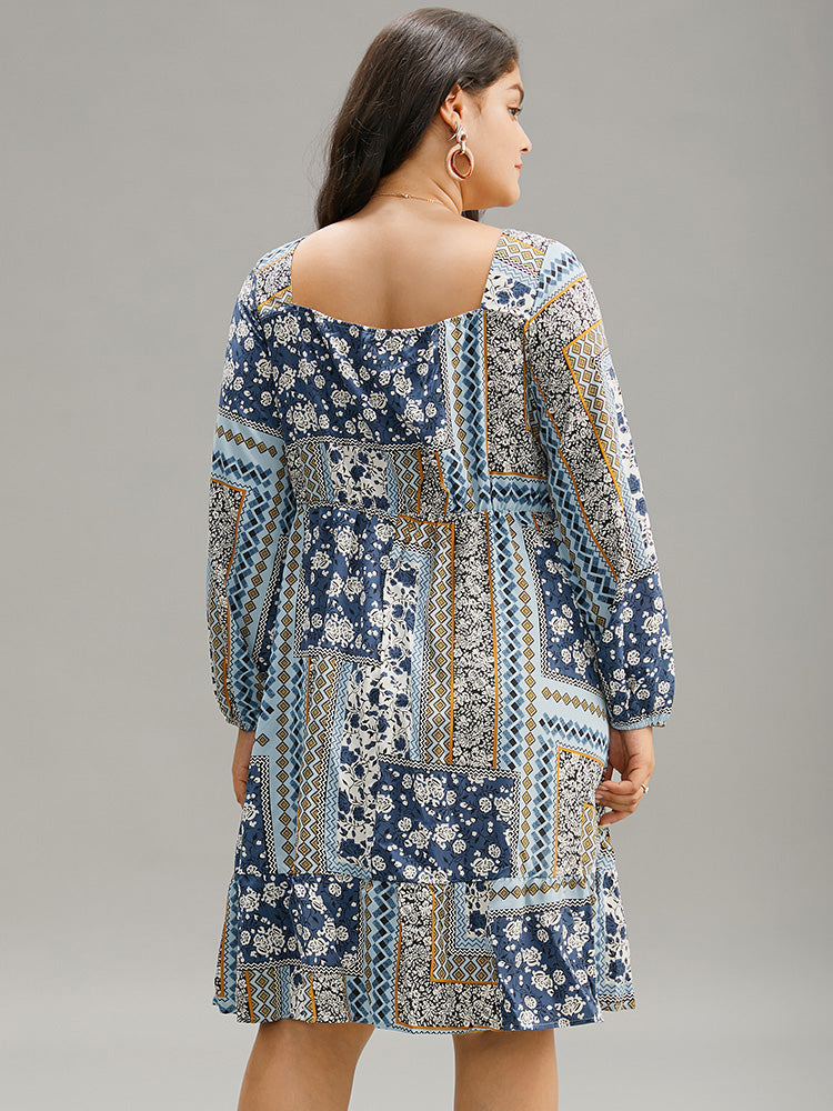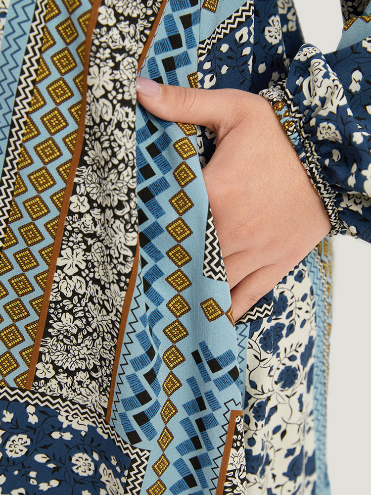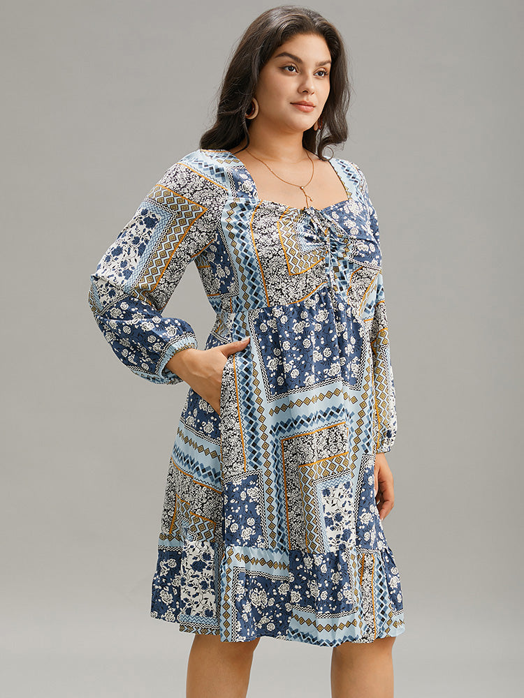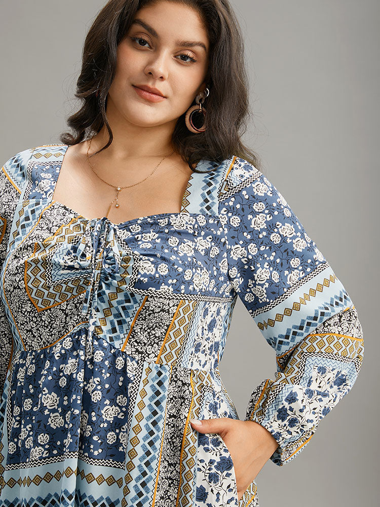 Bandana Print Patchwork Ties Pocket Lantern Sleeve Dress