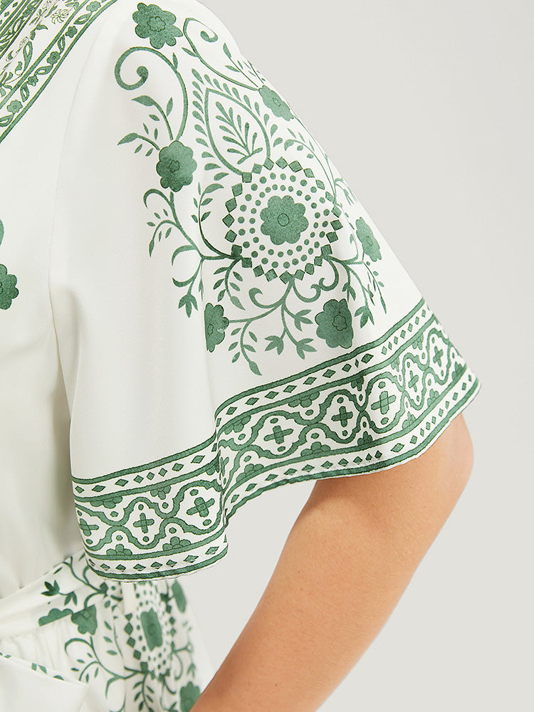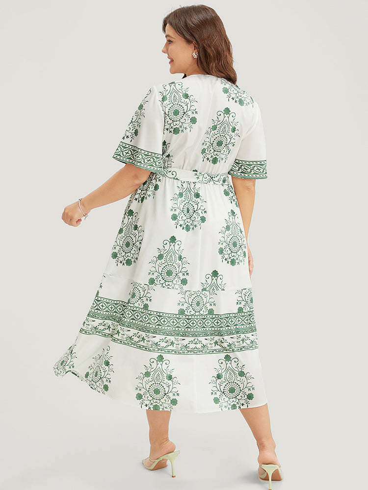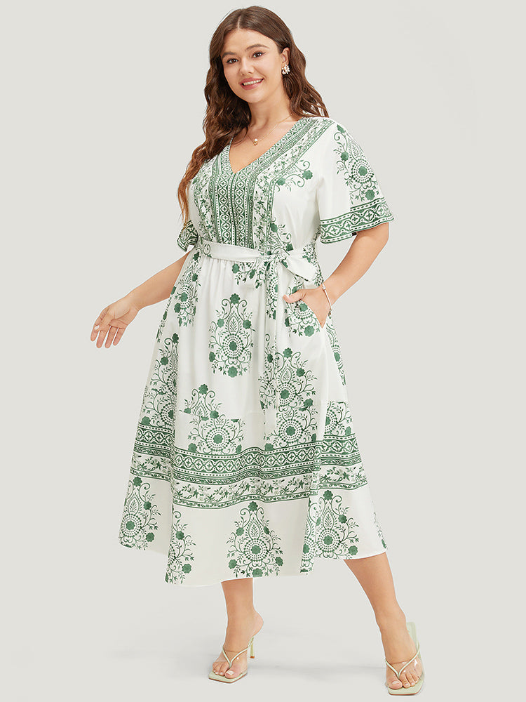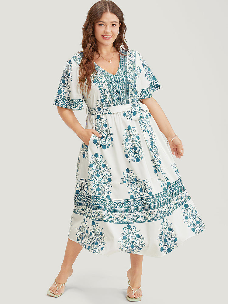 Bandana Print Ruffle Sleeve Pocket Belted Midi Dress
