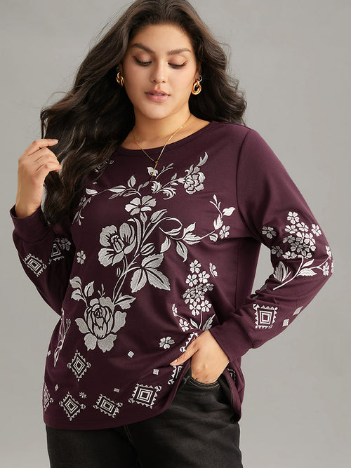 Boho & Floral Textured Embroidery Round Neck Sweatshirt