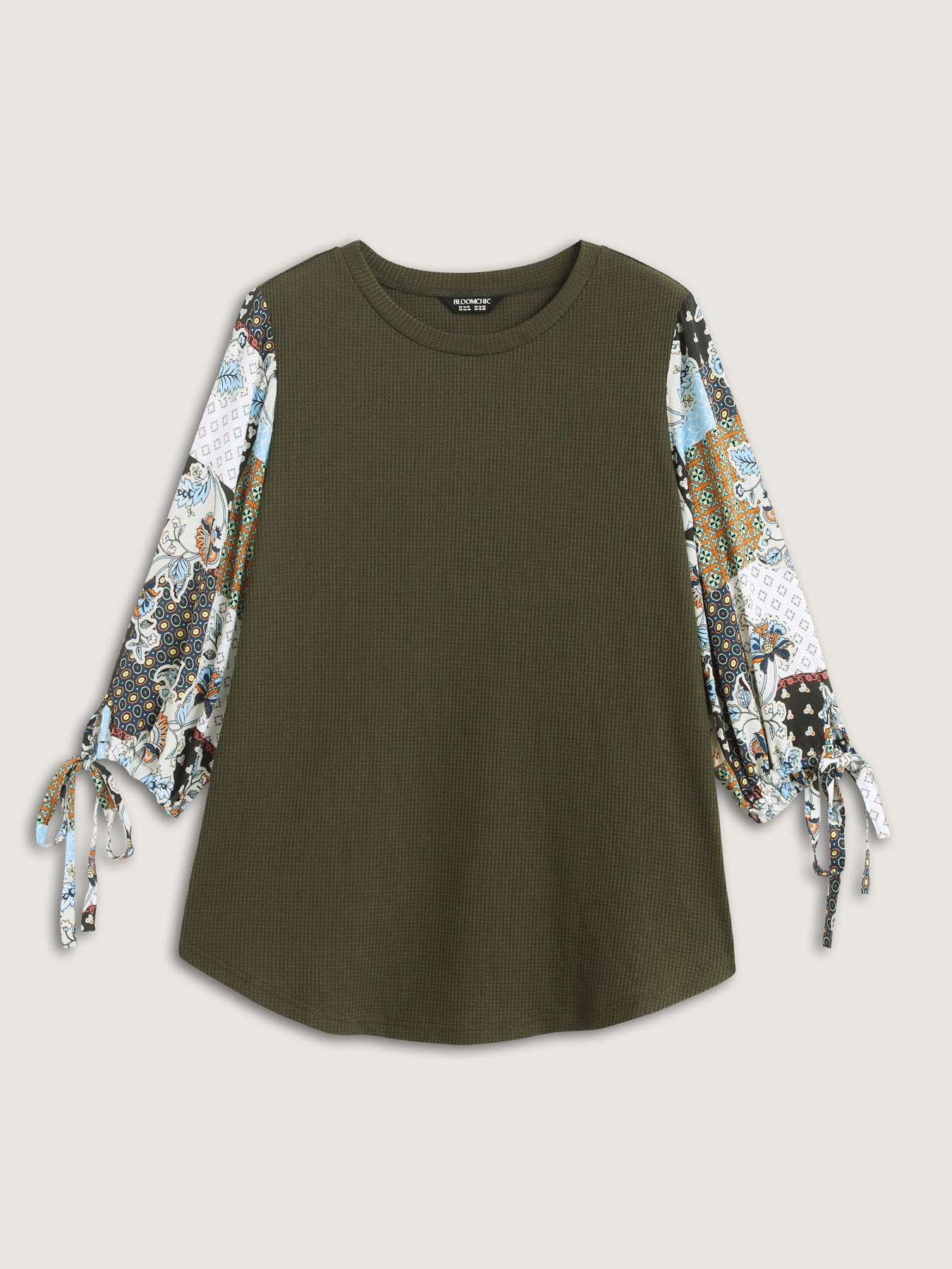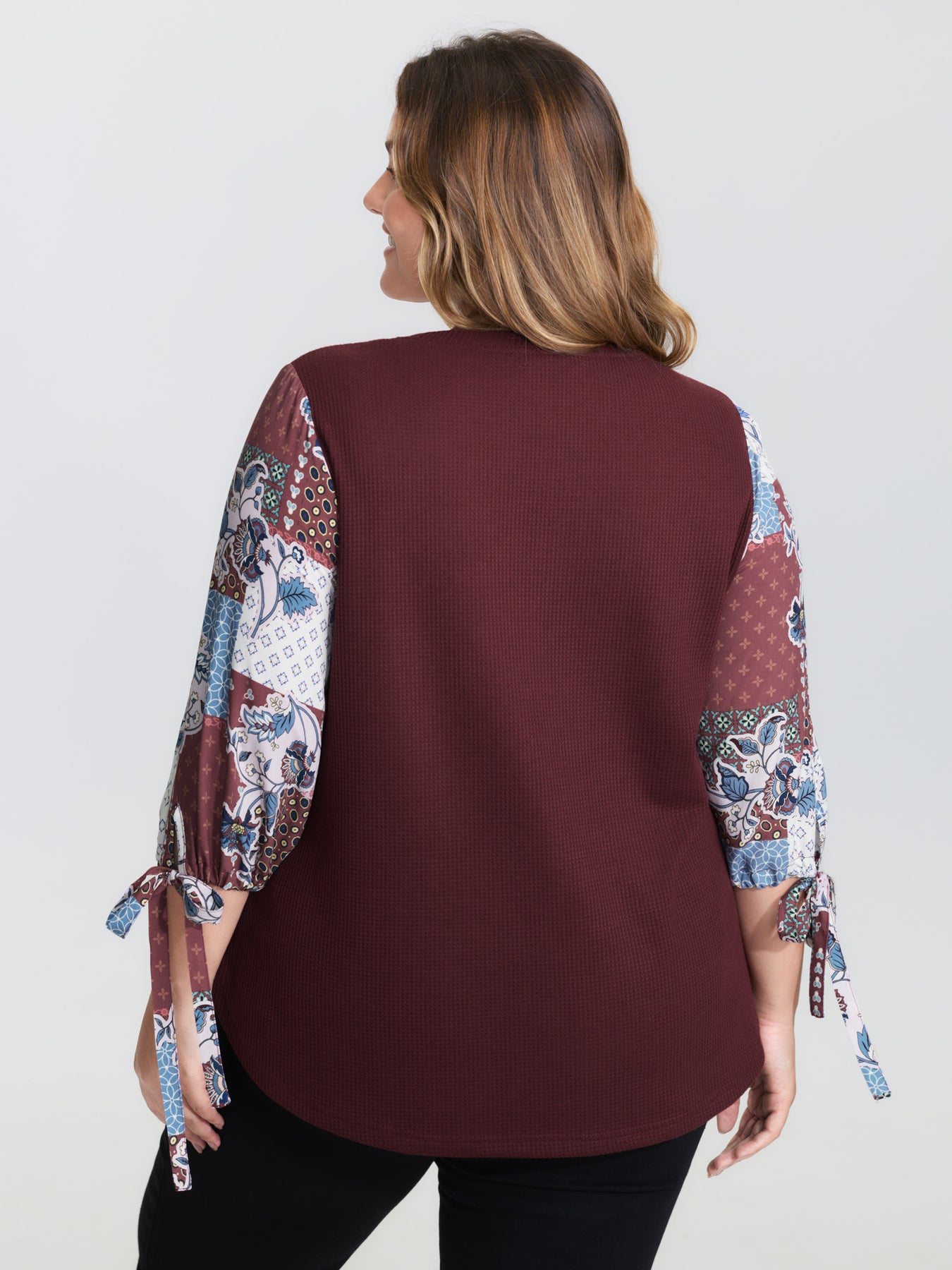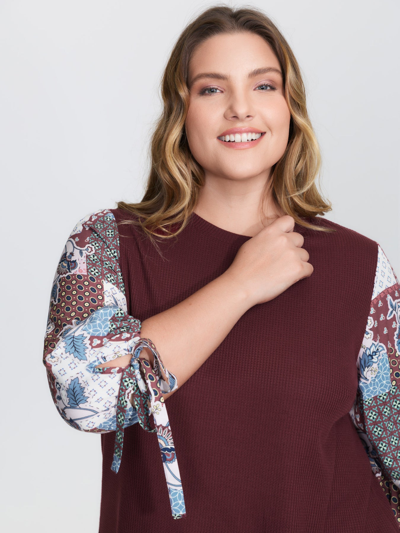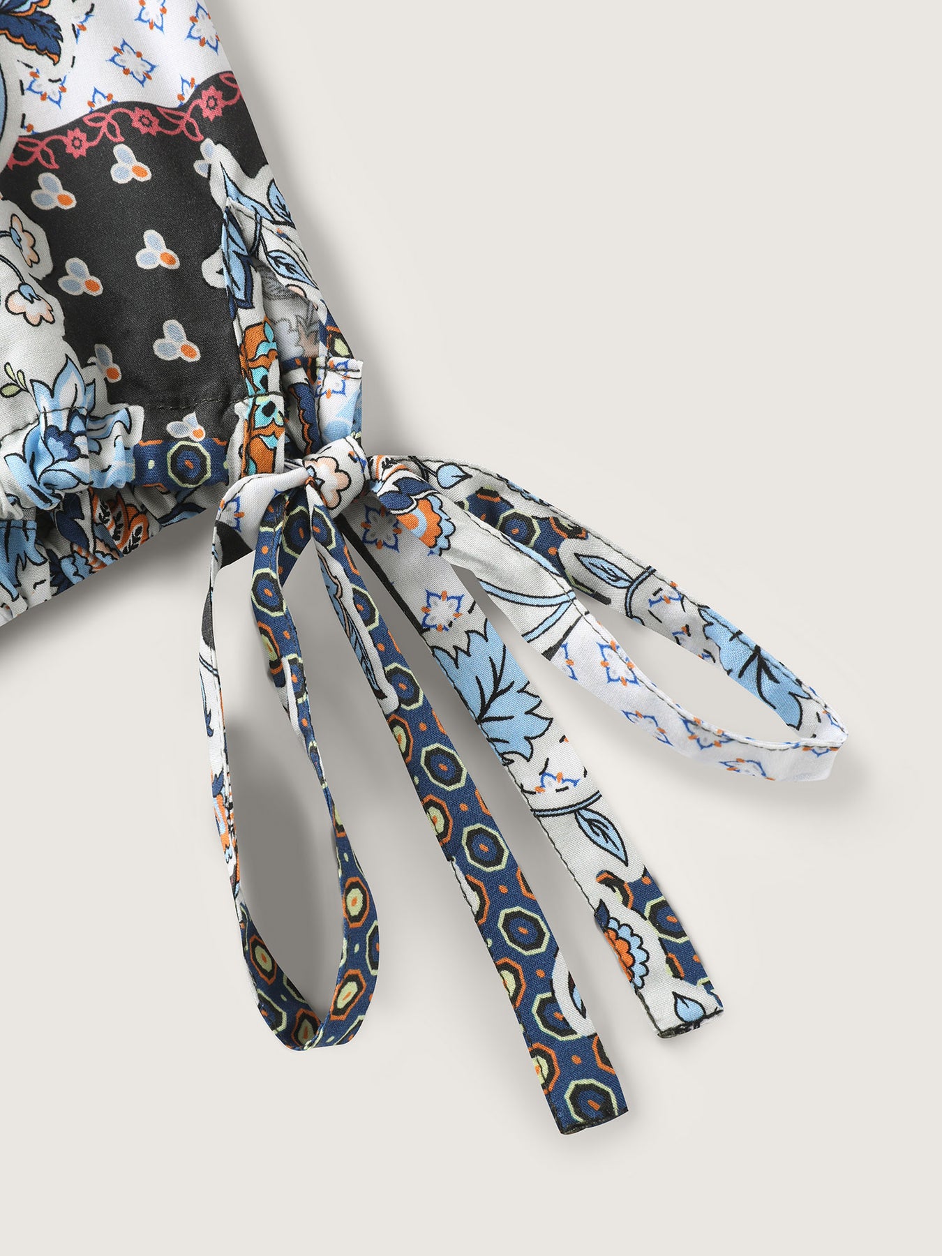 Boho Print Ribbed Sleeve Tie Sweatshirt