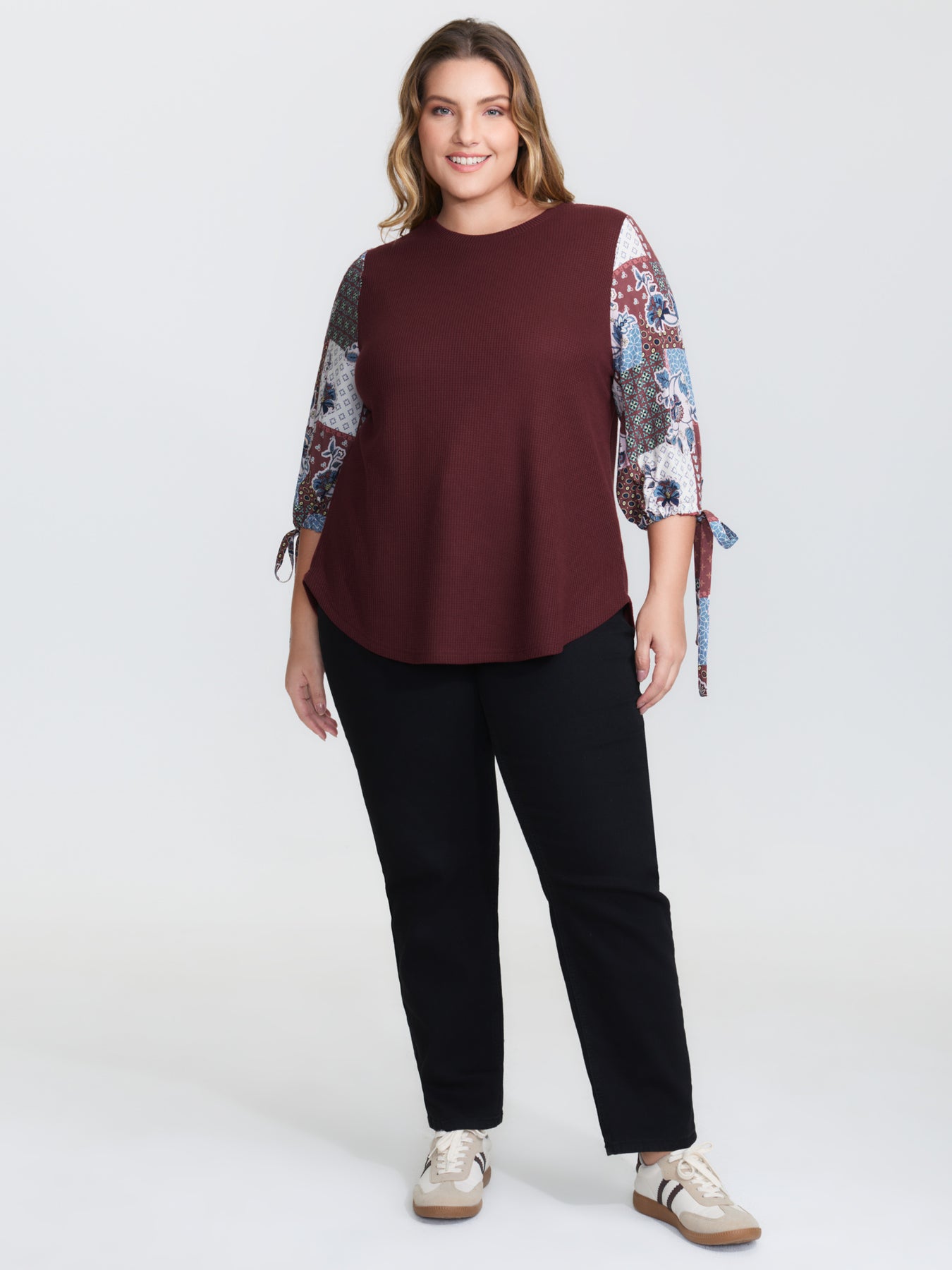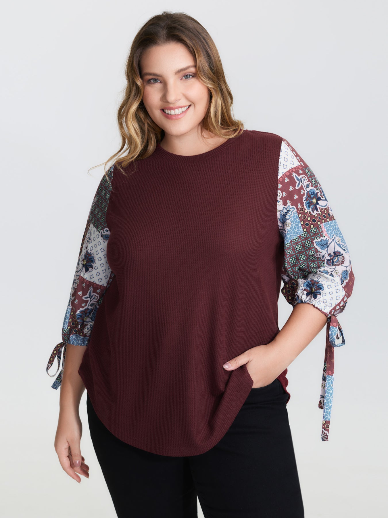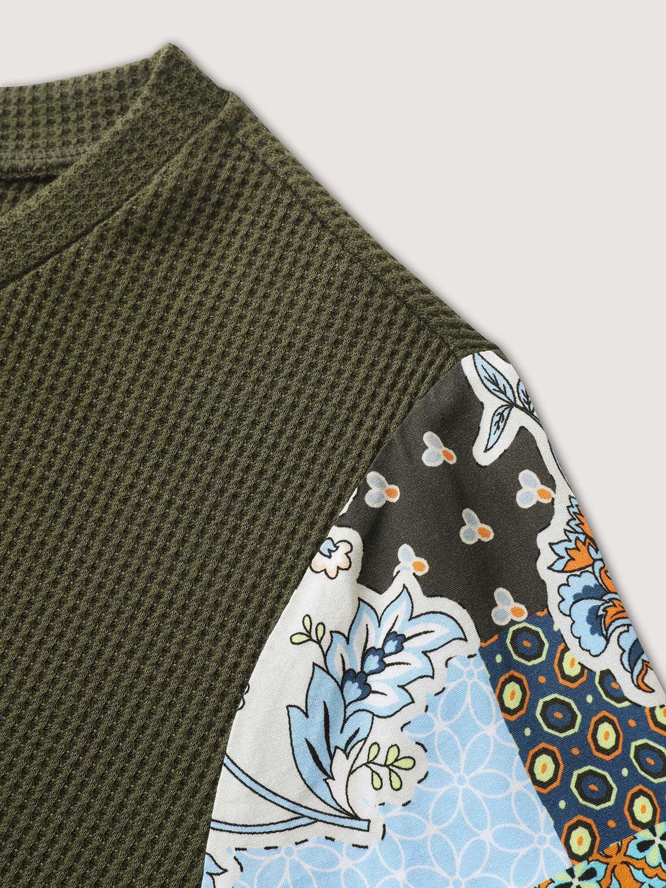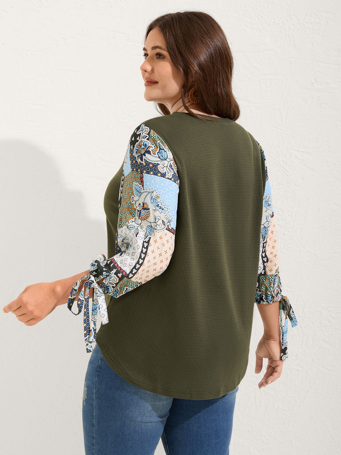 Boho Print Ribbed Sleeve Tie Sweatshirt