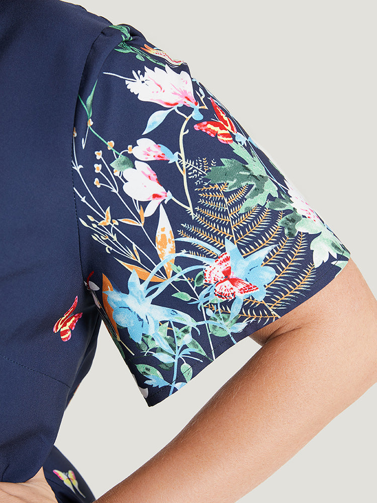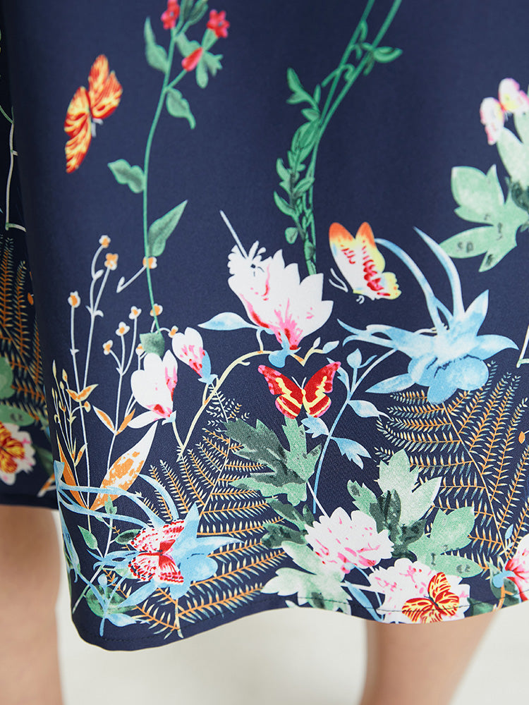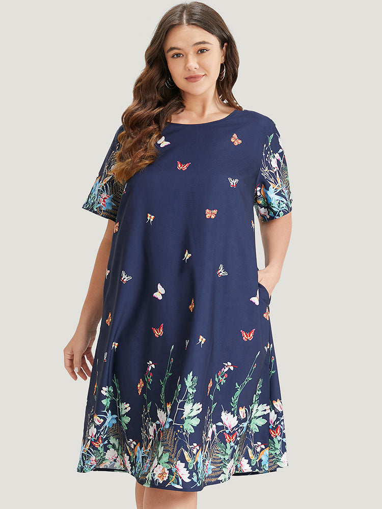 Butterfly & Floral Round Neck Print Pocket Knee Dress