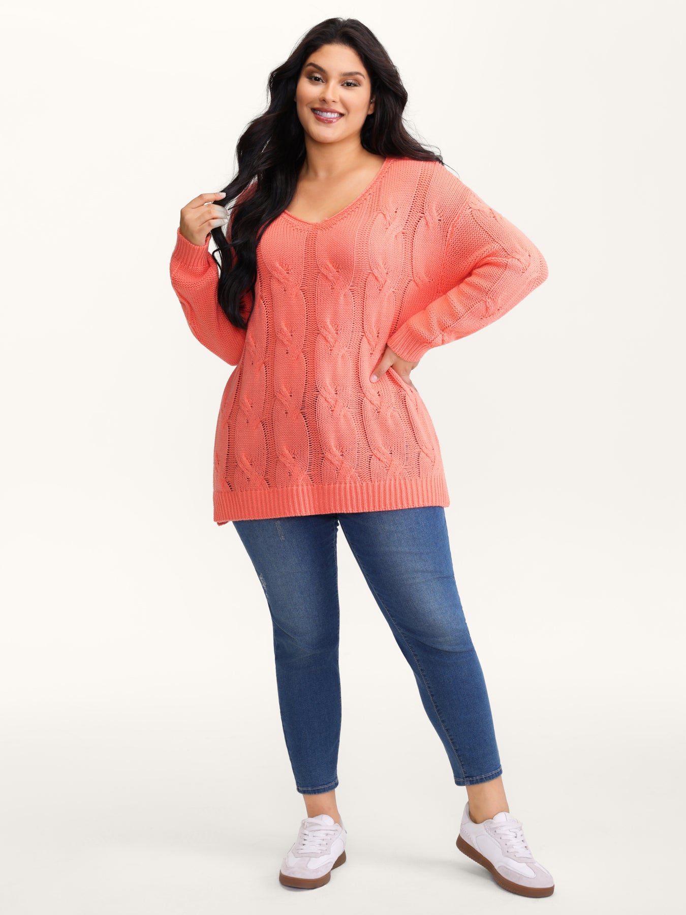 Cable Knit V-Neck Solid Pullover