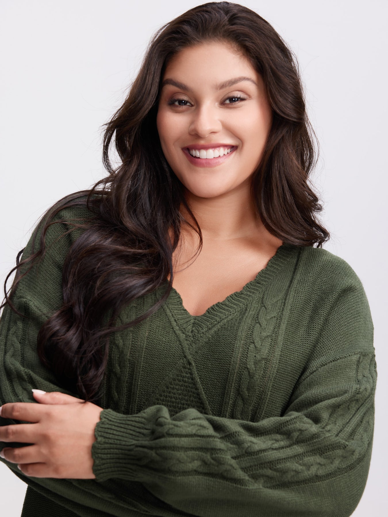CableKnit Balloon Sleeve V-Neck Pullover