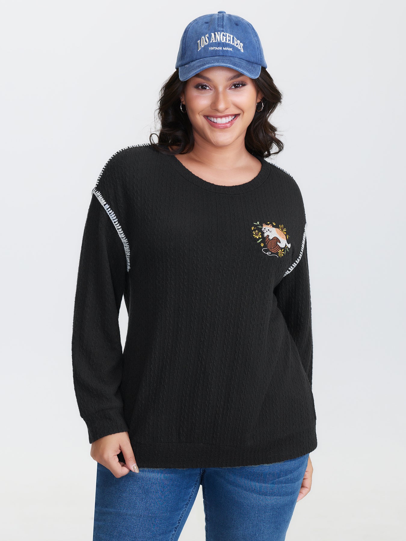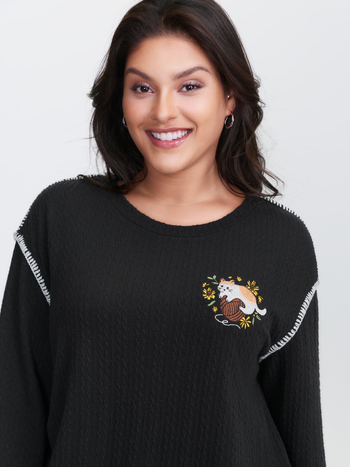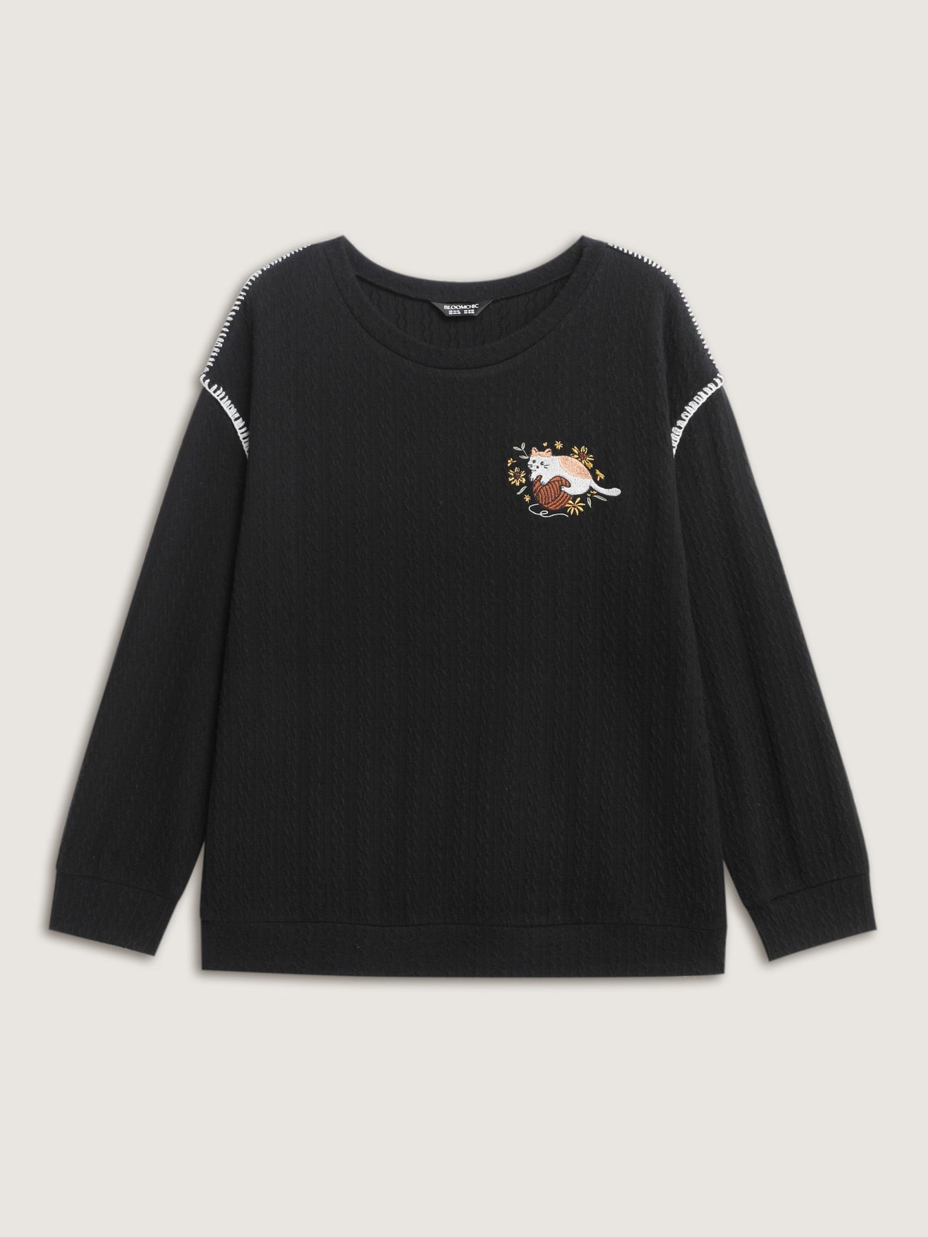 Cat Embroidered Dogstooth Edge Sweatshirt