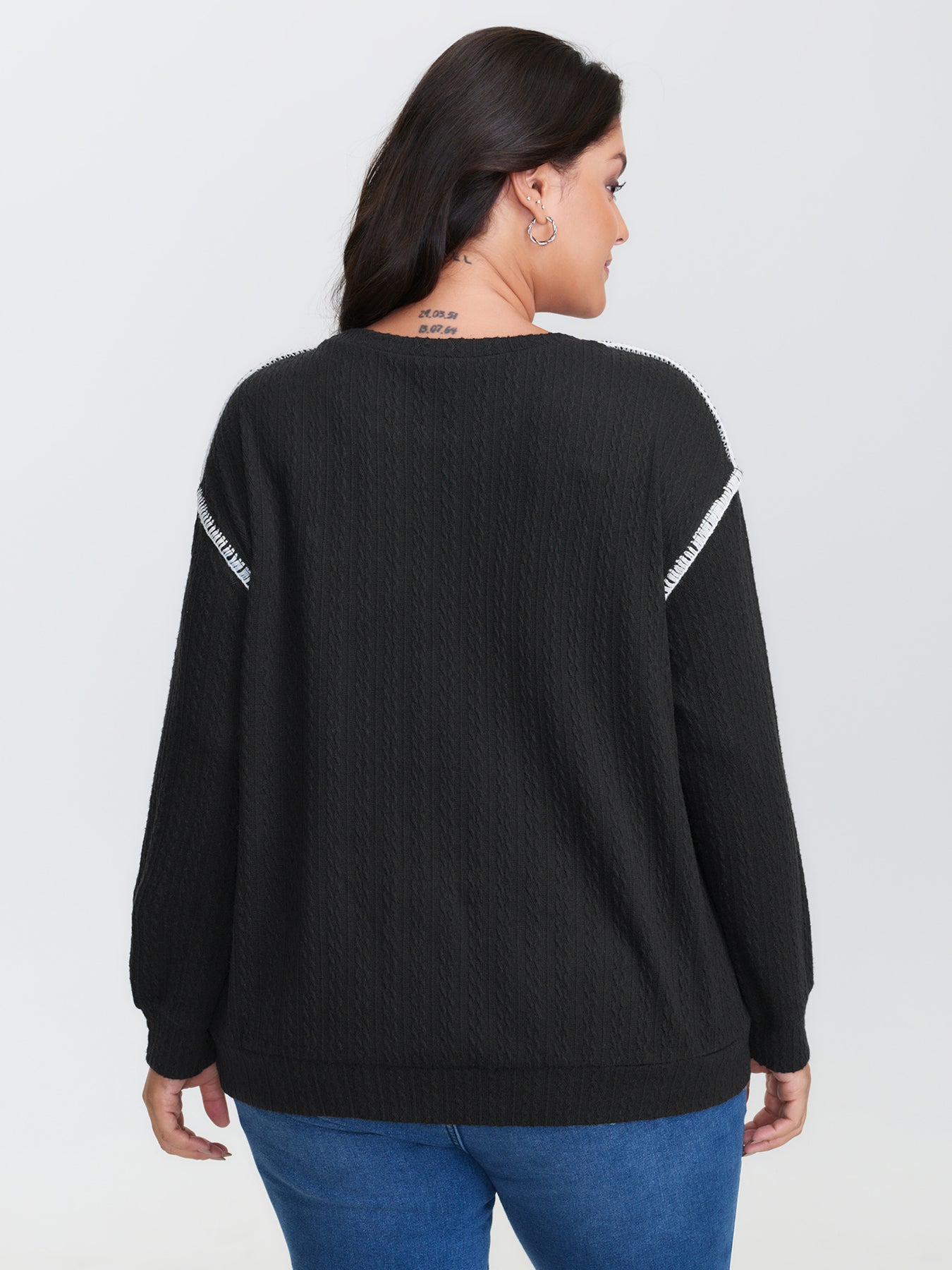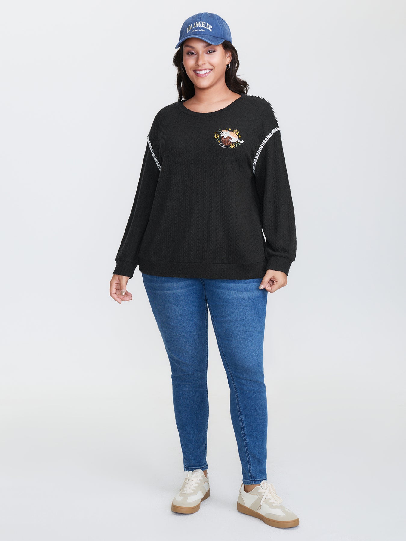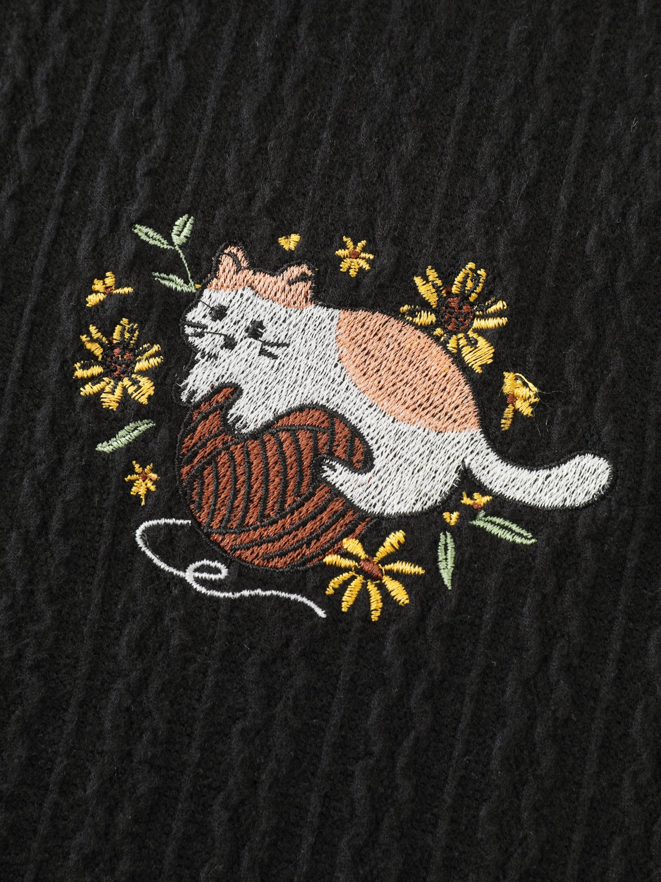 Cat Embroidered Dogstooth Edge Sweatshirt