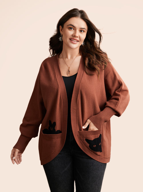 Cat Printed Pockets Arc Hem Cardigan