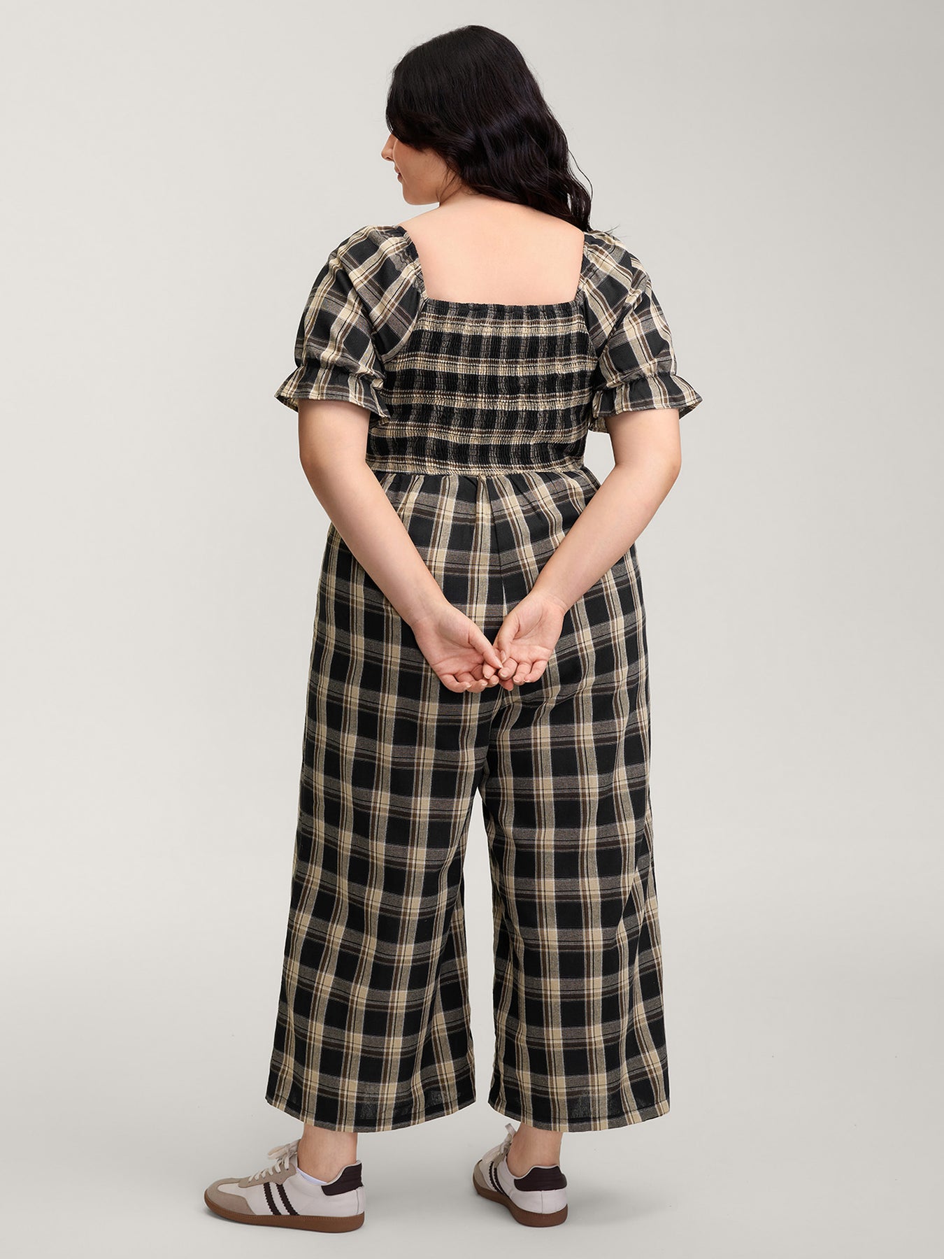 Classic Plaid Print Shirred Bodice Jumpsuit