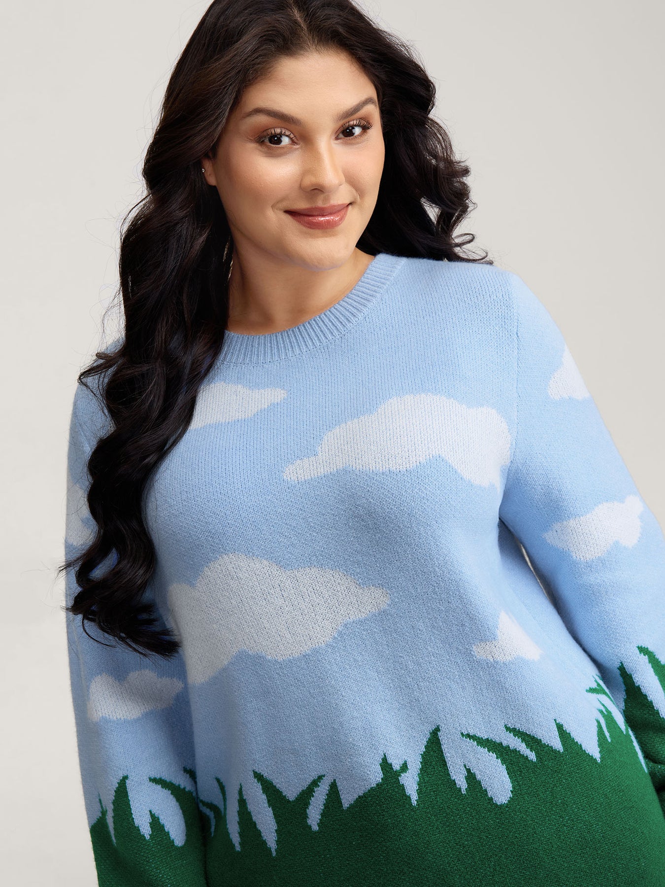 Cloudy Grass Print Jacquard Balloon Sleeve Pullover