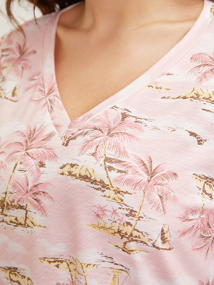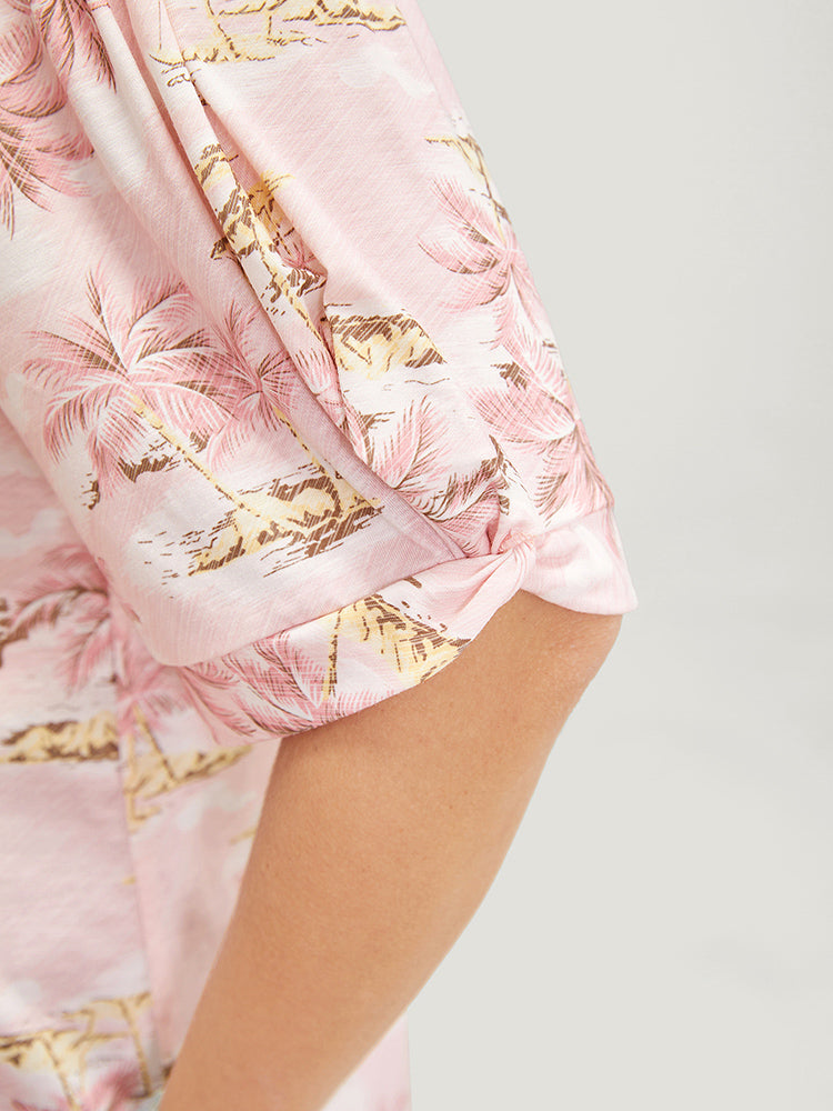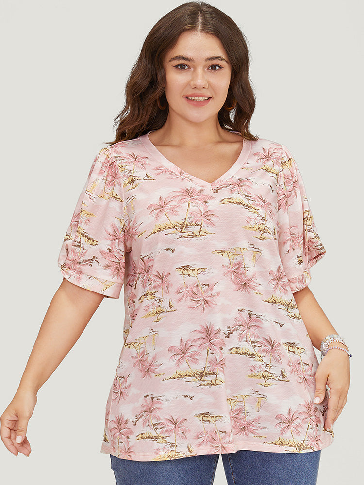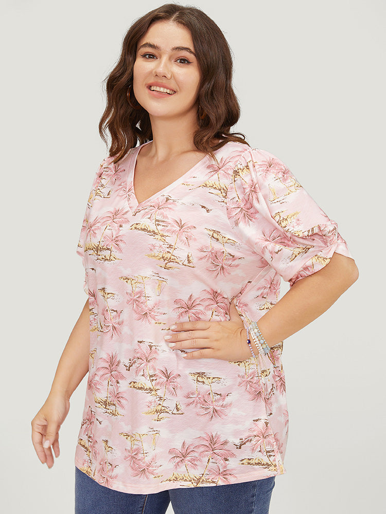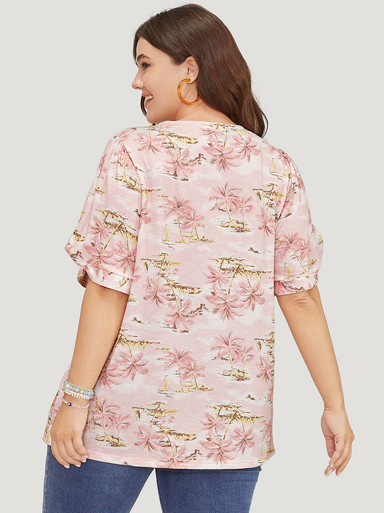Coconut Tree Print Gathered Twist Sleeve T-shirt