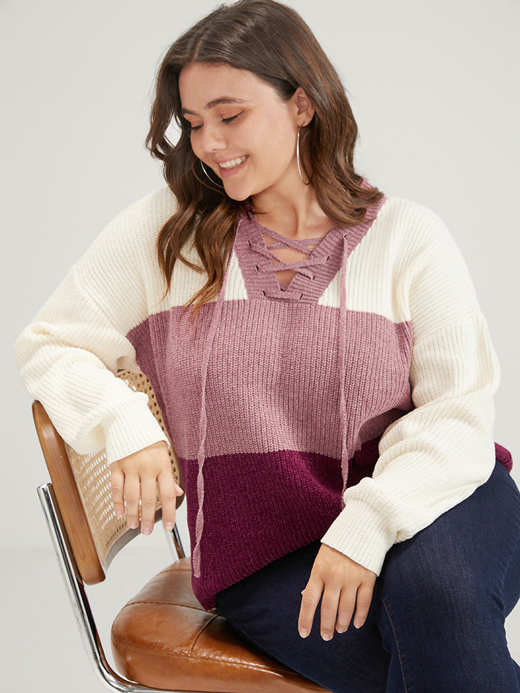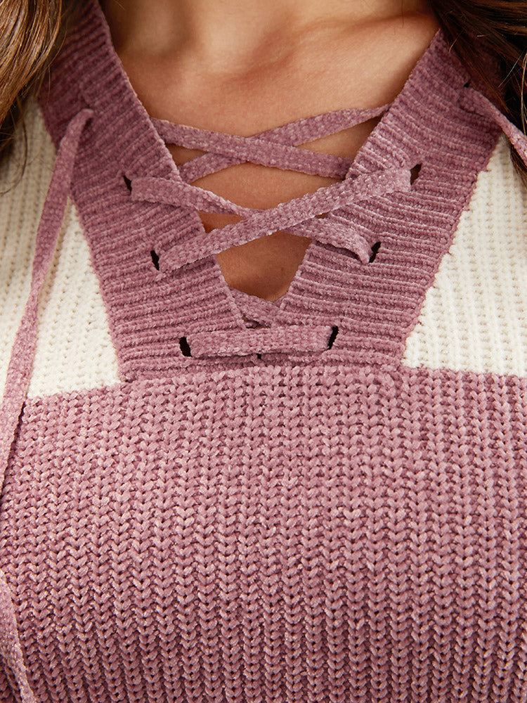 Colorblock Contrast Chenille Knit Lace Up V Neck Knit Top