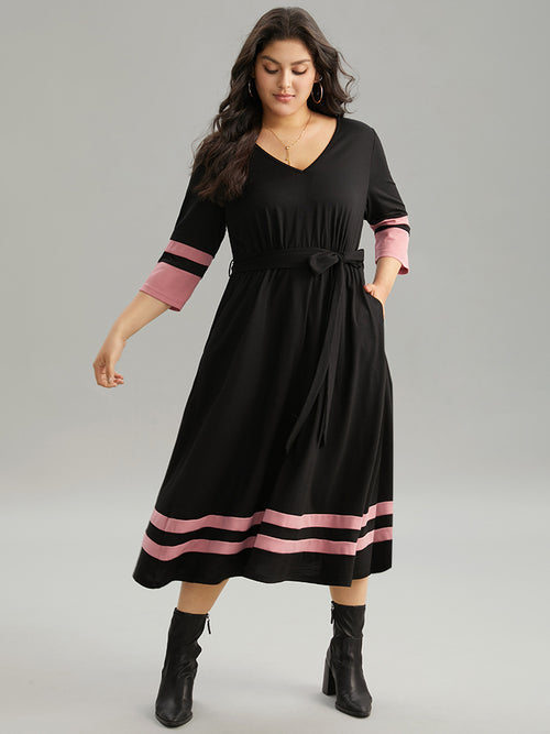 Colorblock Contrast Elastic Waist Pocket Belted Dress