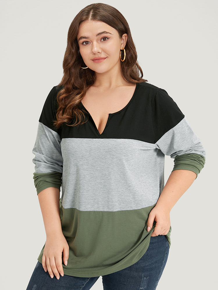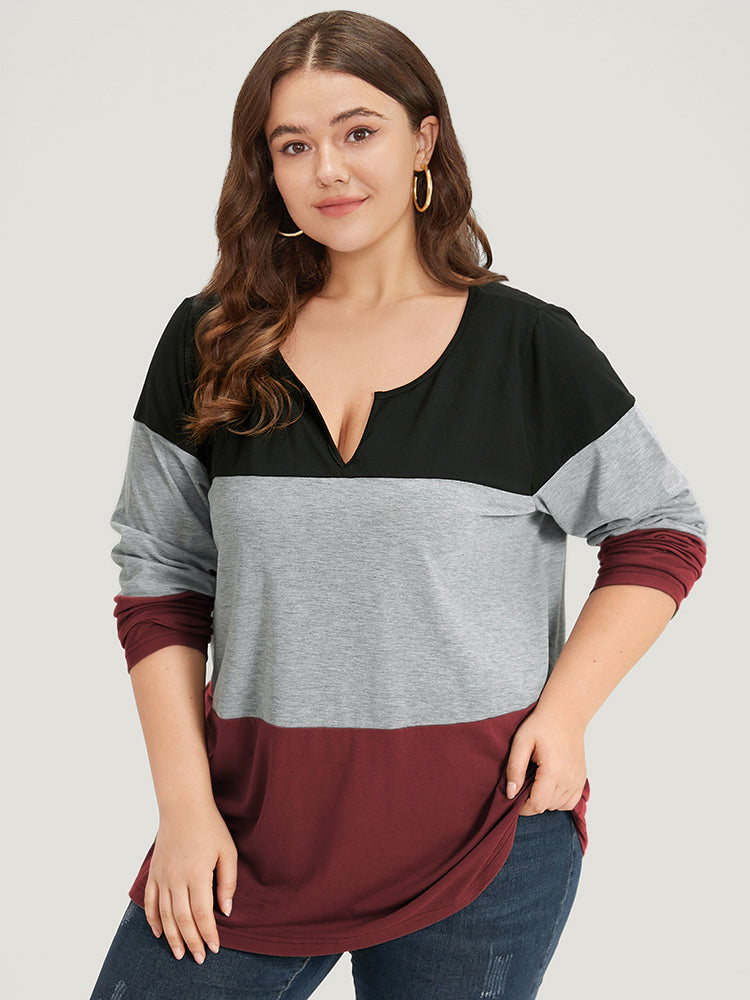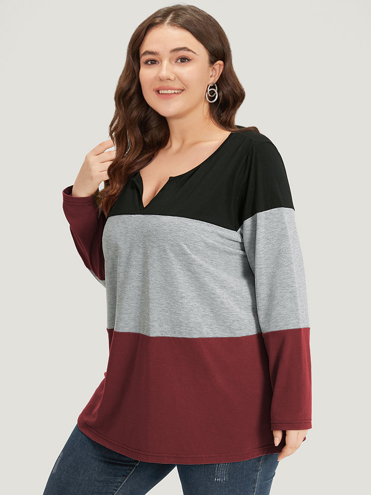 Colorblock Contrast Notched Long Sleeve T-shirt