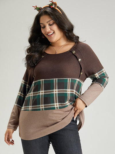 Colorblock Plaid Patchwork Button Detail T-shirt