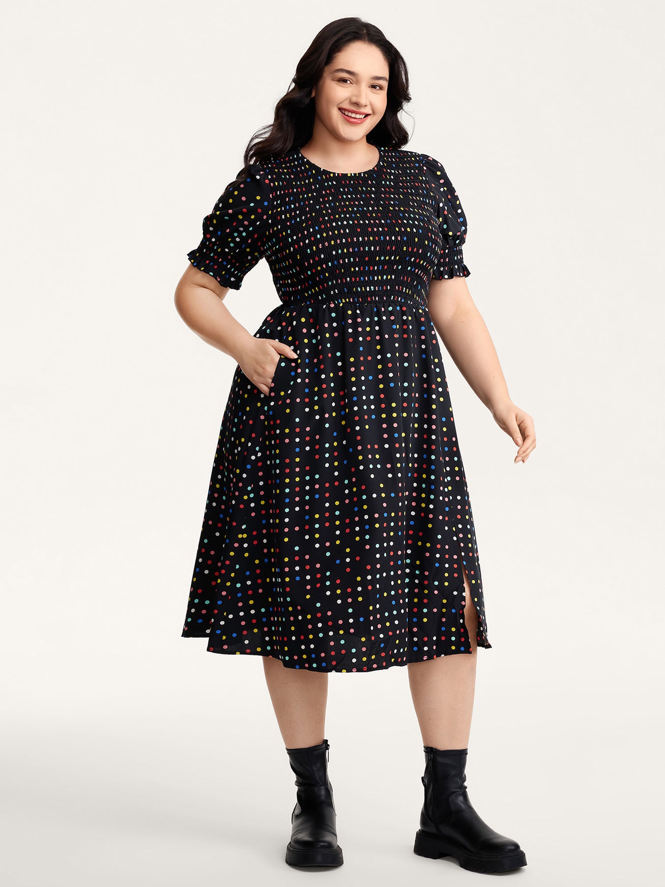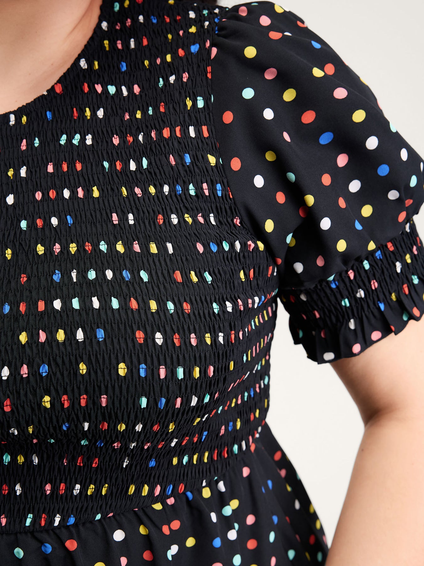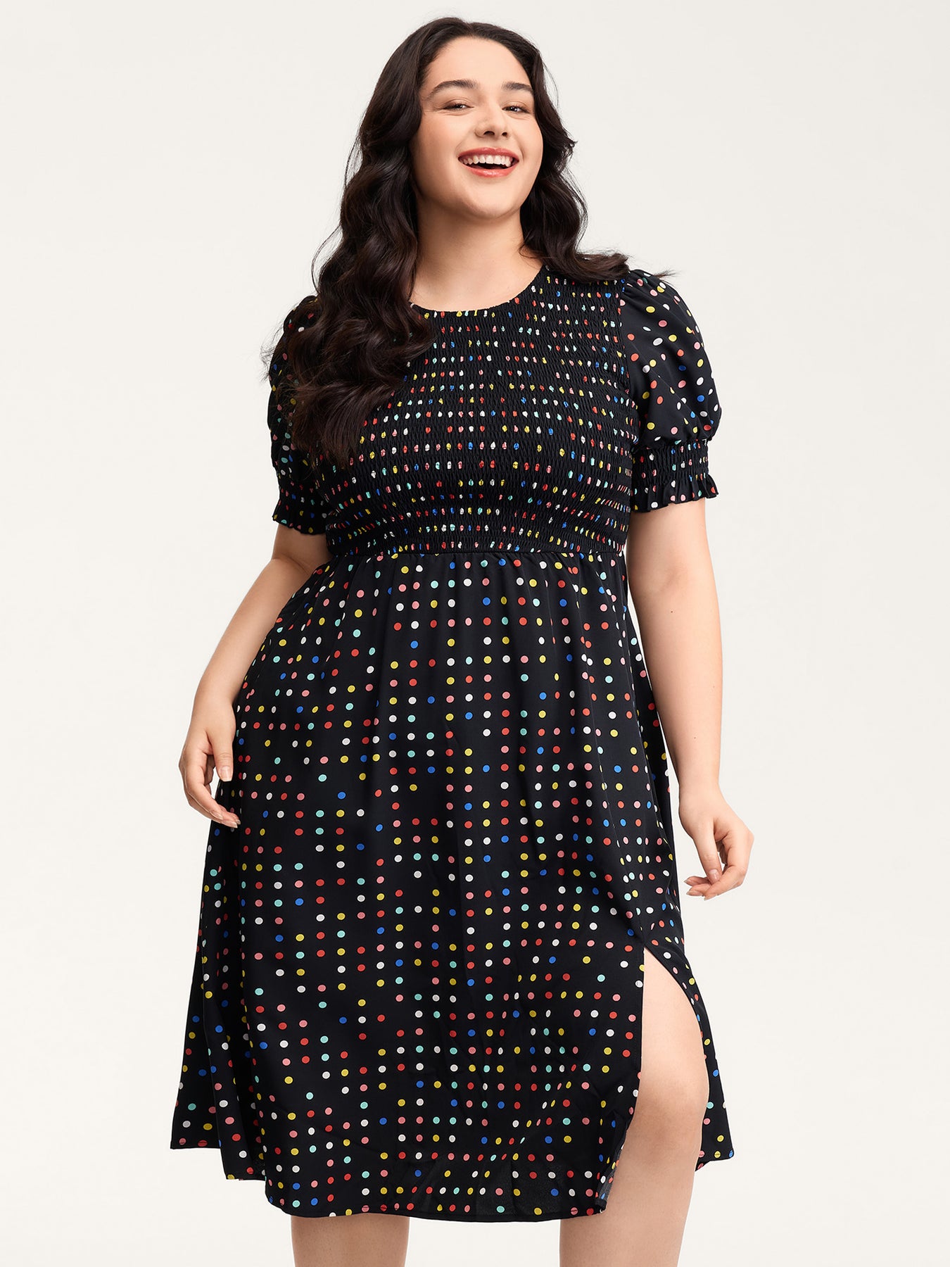 Colorful Polka Dots Shirred Bodice Midi Dress