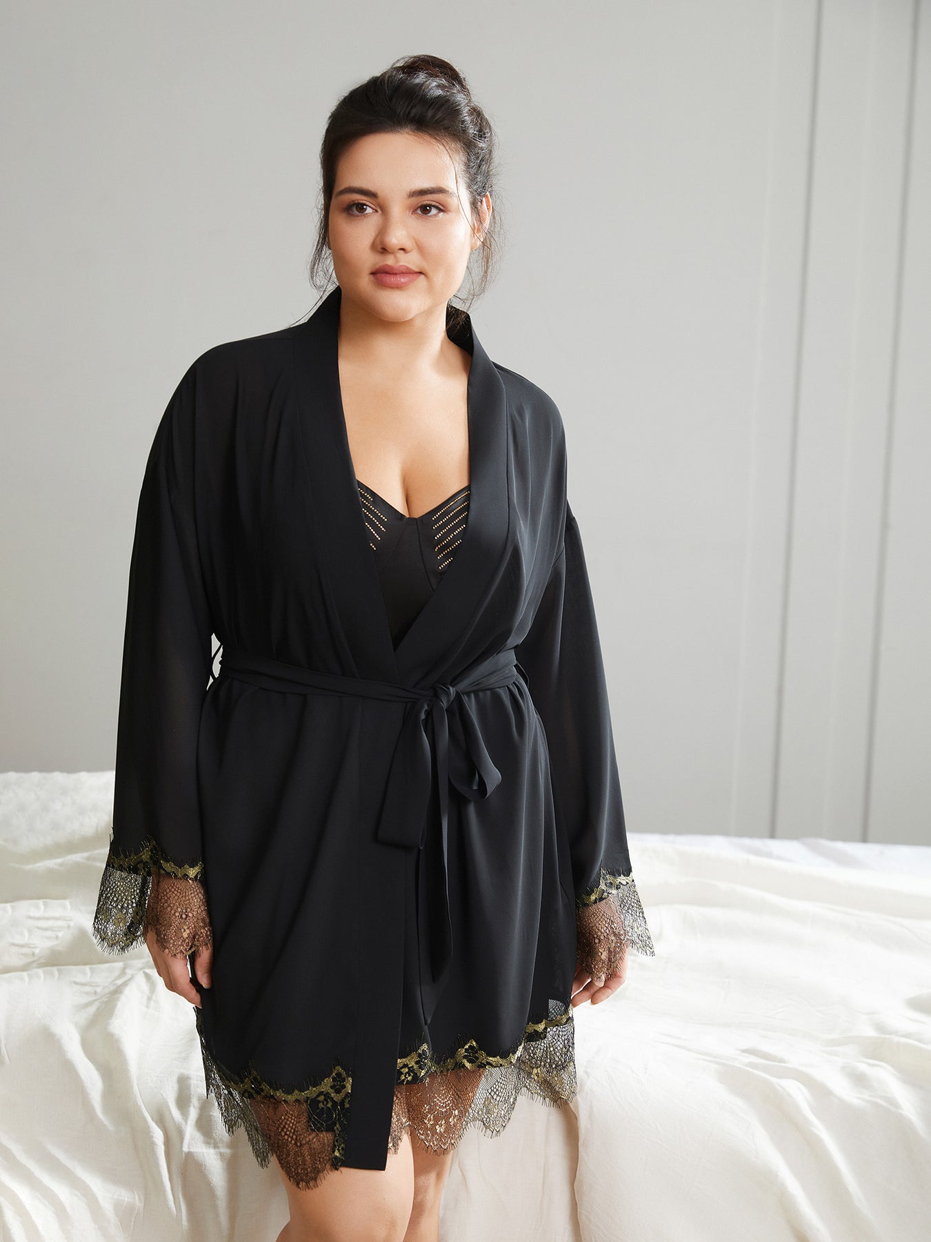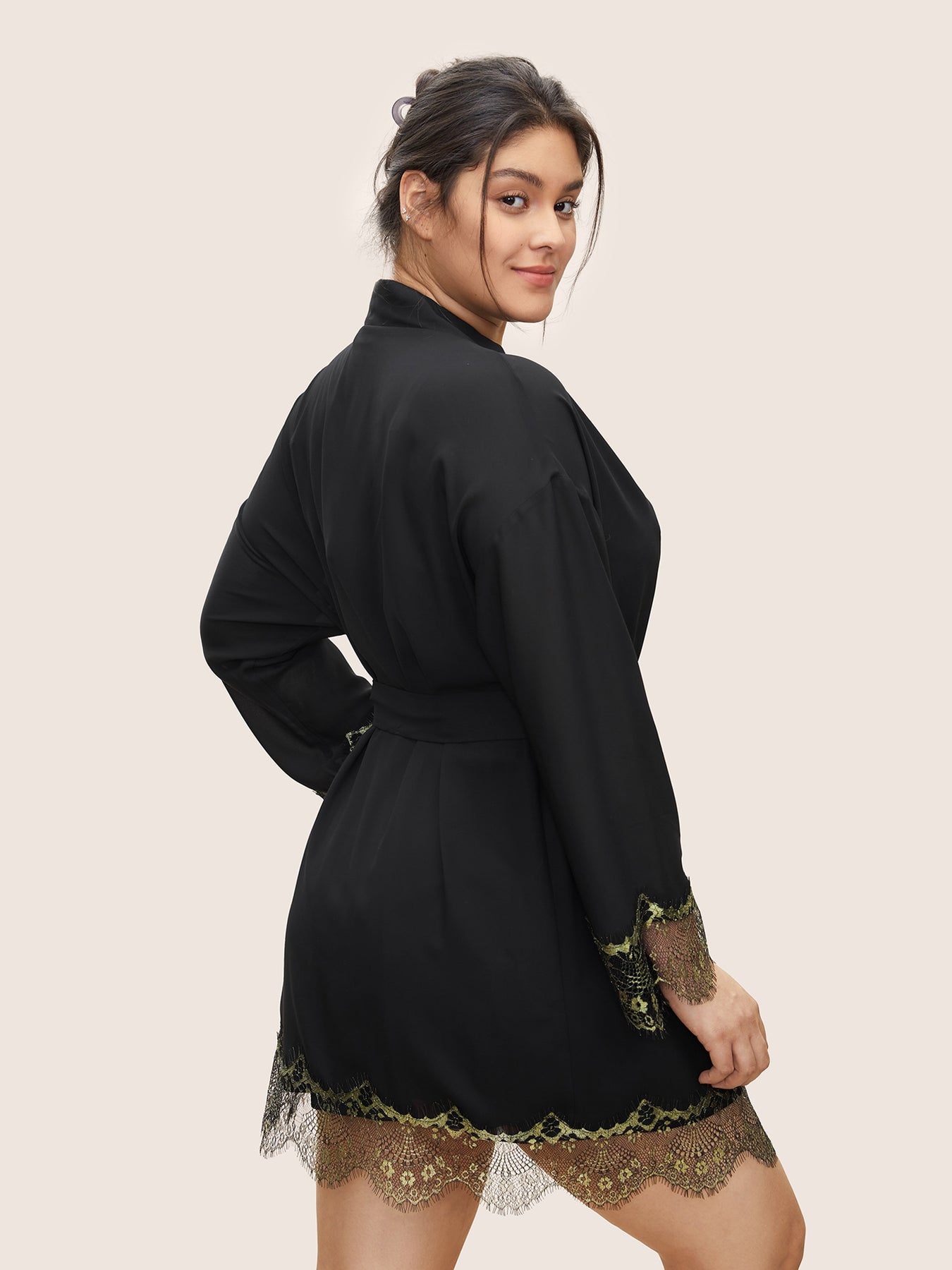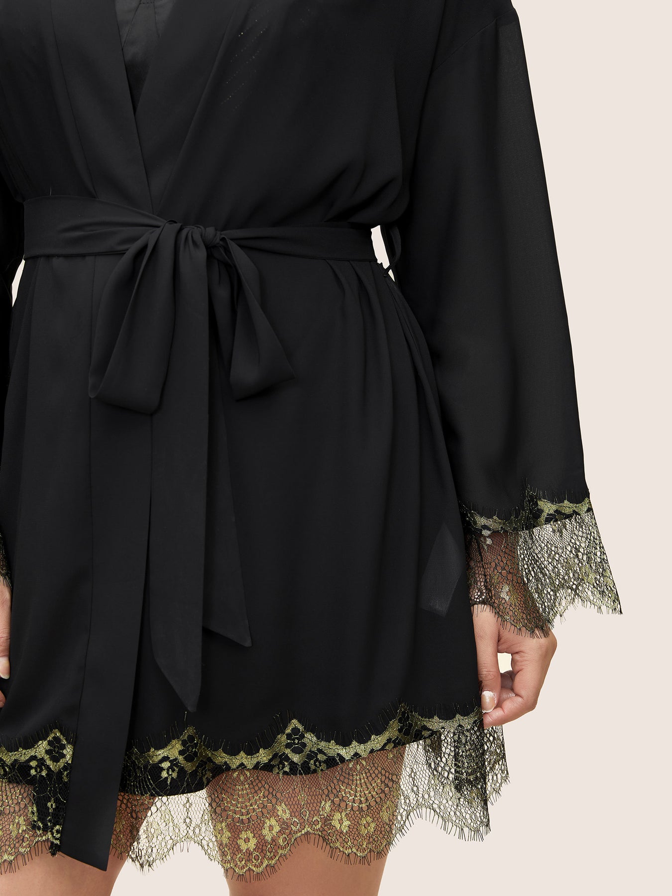 Contrast Lace Patchwork Scalloped Trim Belted Robe