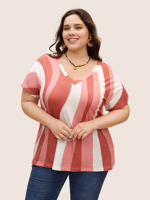 Contrast Striped V Neck Batwing Sleeve T-shirt