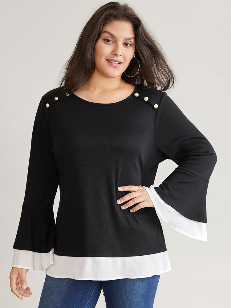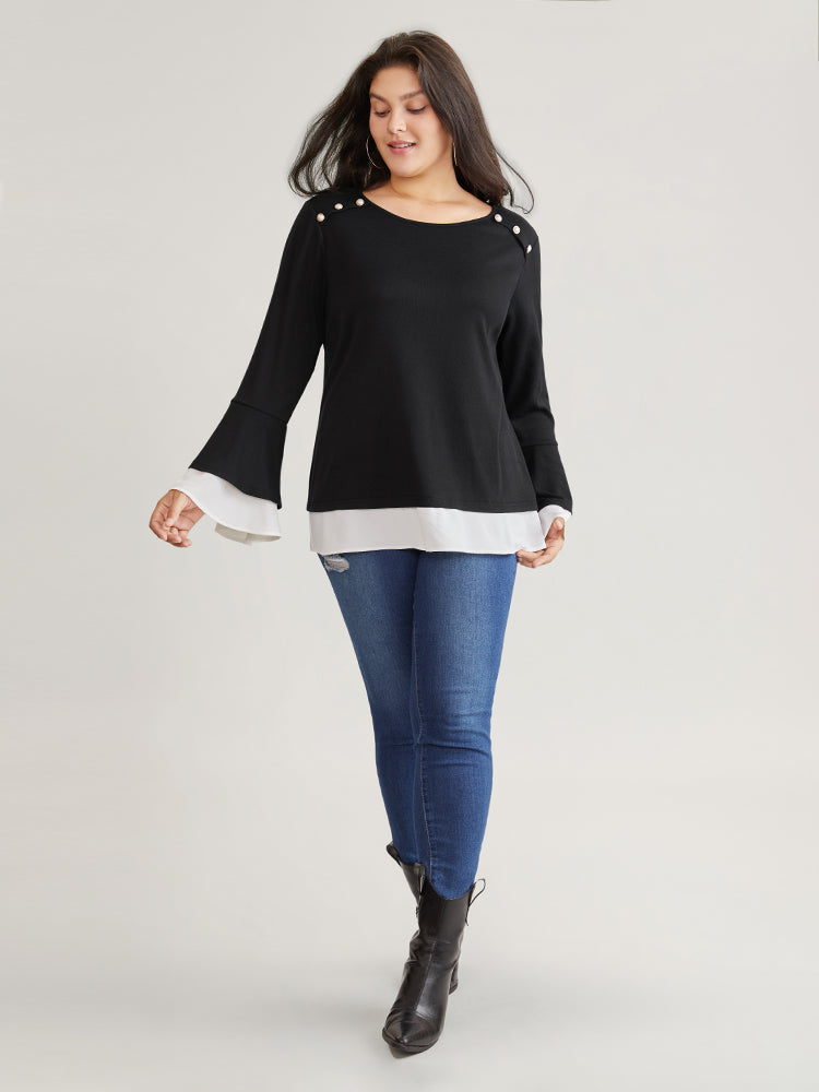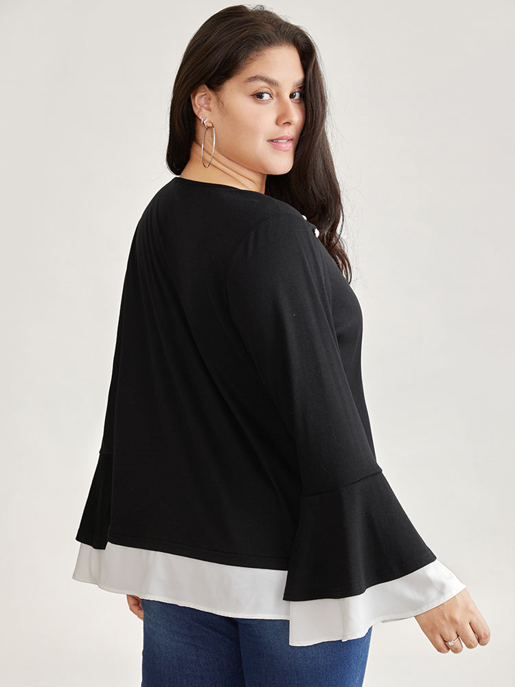 Contrast Tiered Bell Sleeve Button Detail T-shirt