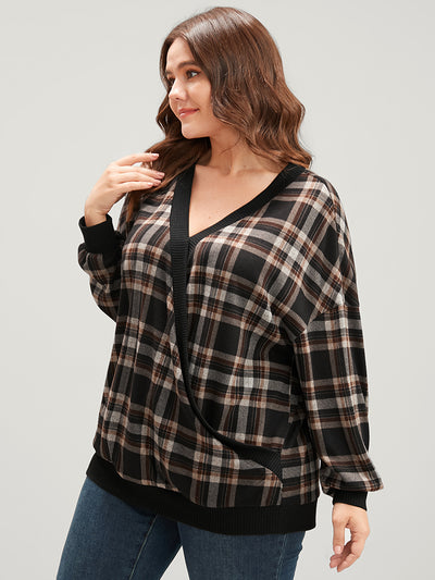 Contrast Trim Lantern Sleeve Tartan Wrap Sweatshirt
