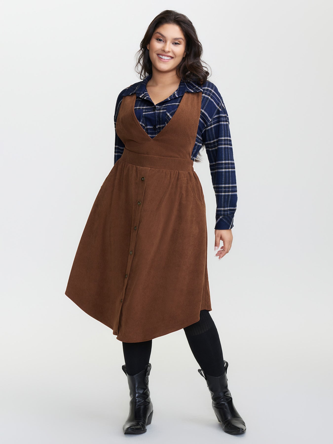 Corduroy Deep V-Neck Adjustable Midi Dress