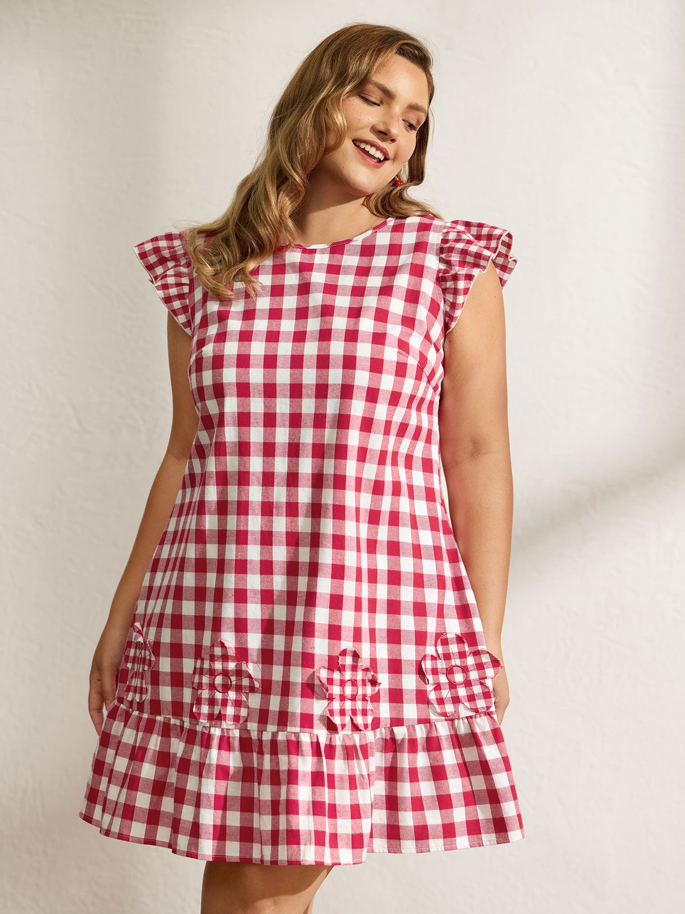Cotton Gingham Embroidered Ruffled Hem Knee Dress
