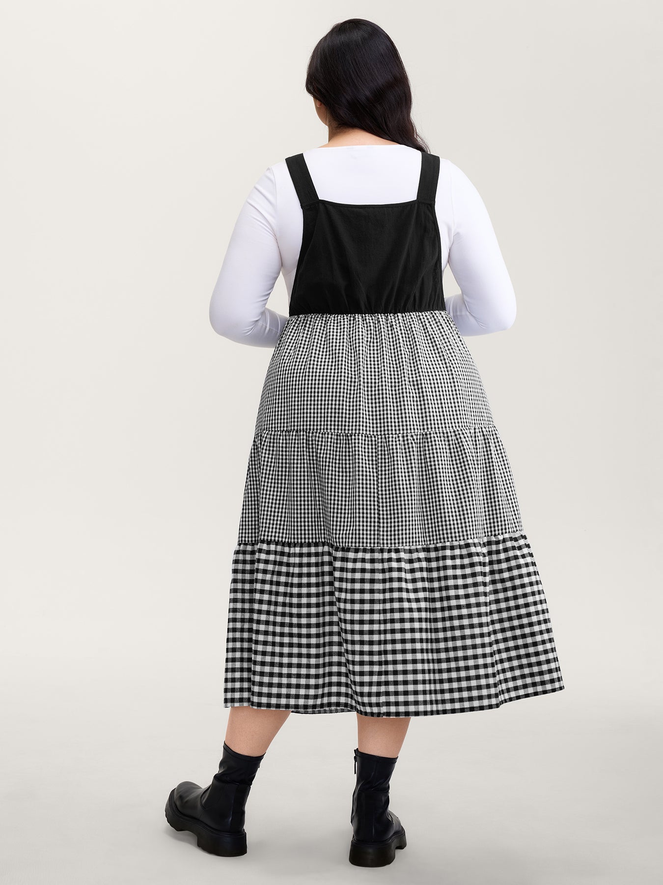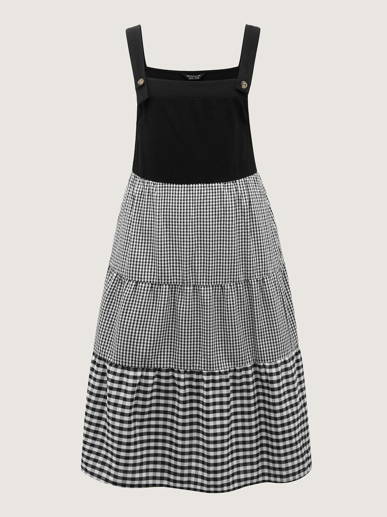 Cotton Gingham Patchwork Overall Strap Midi Dress