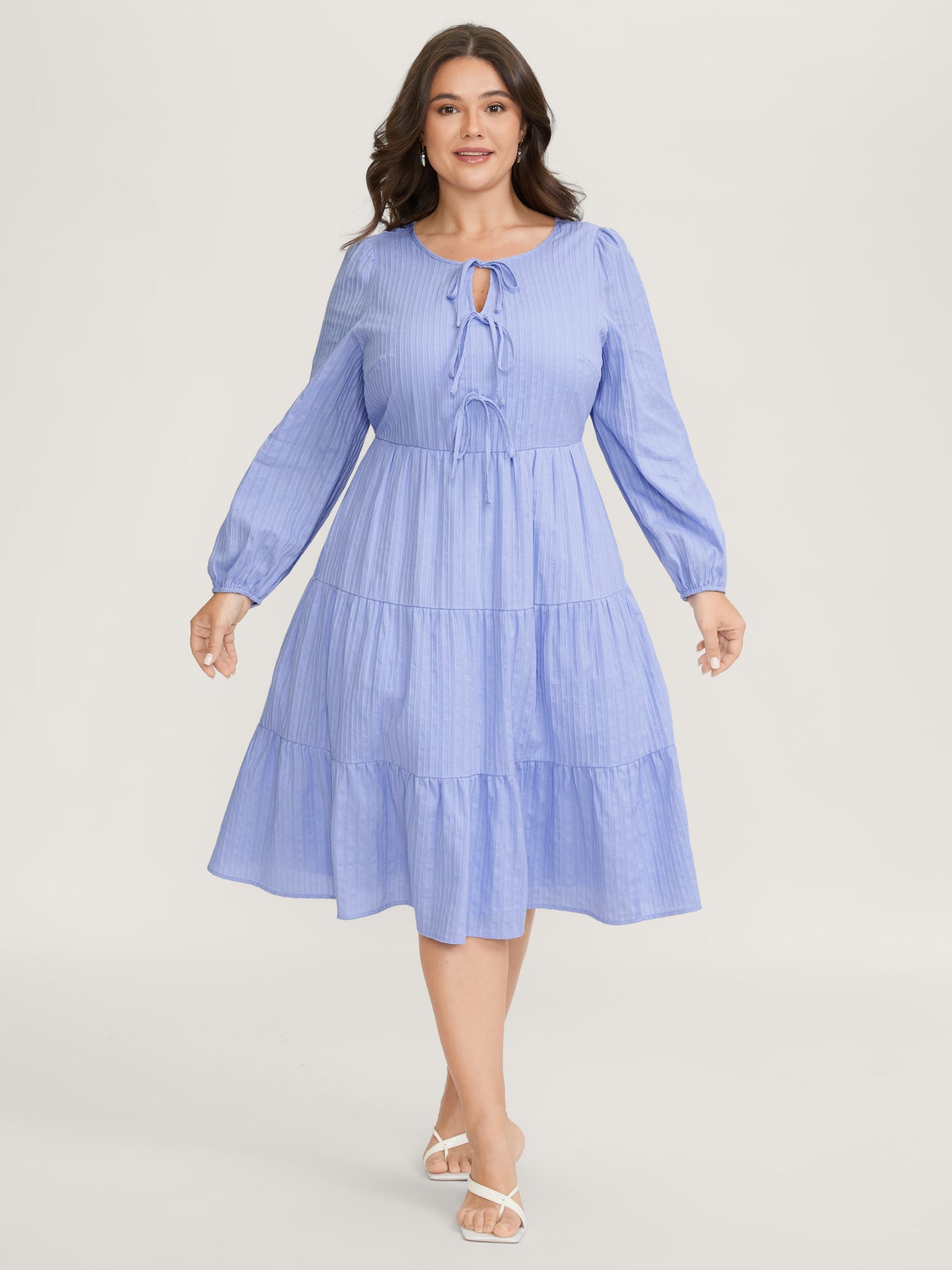 Cotton Textured Bow-Tie Detail Tiered Midi Dress