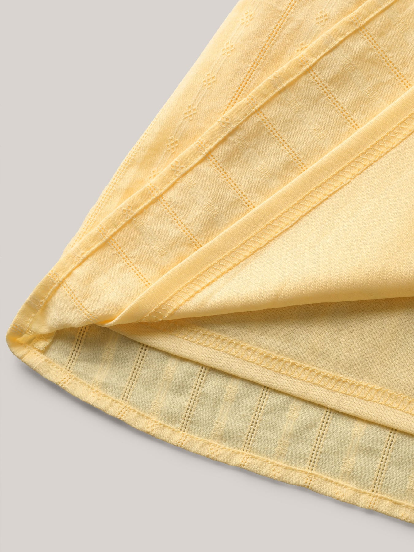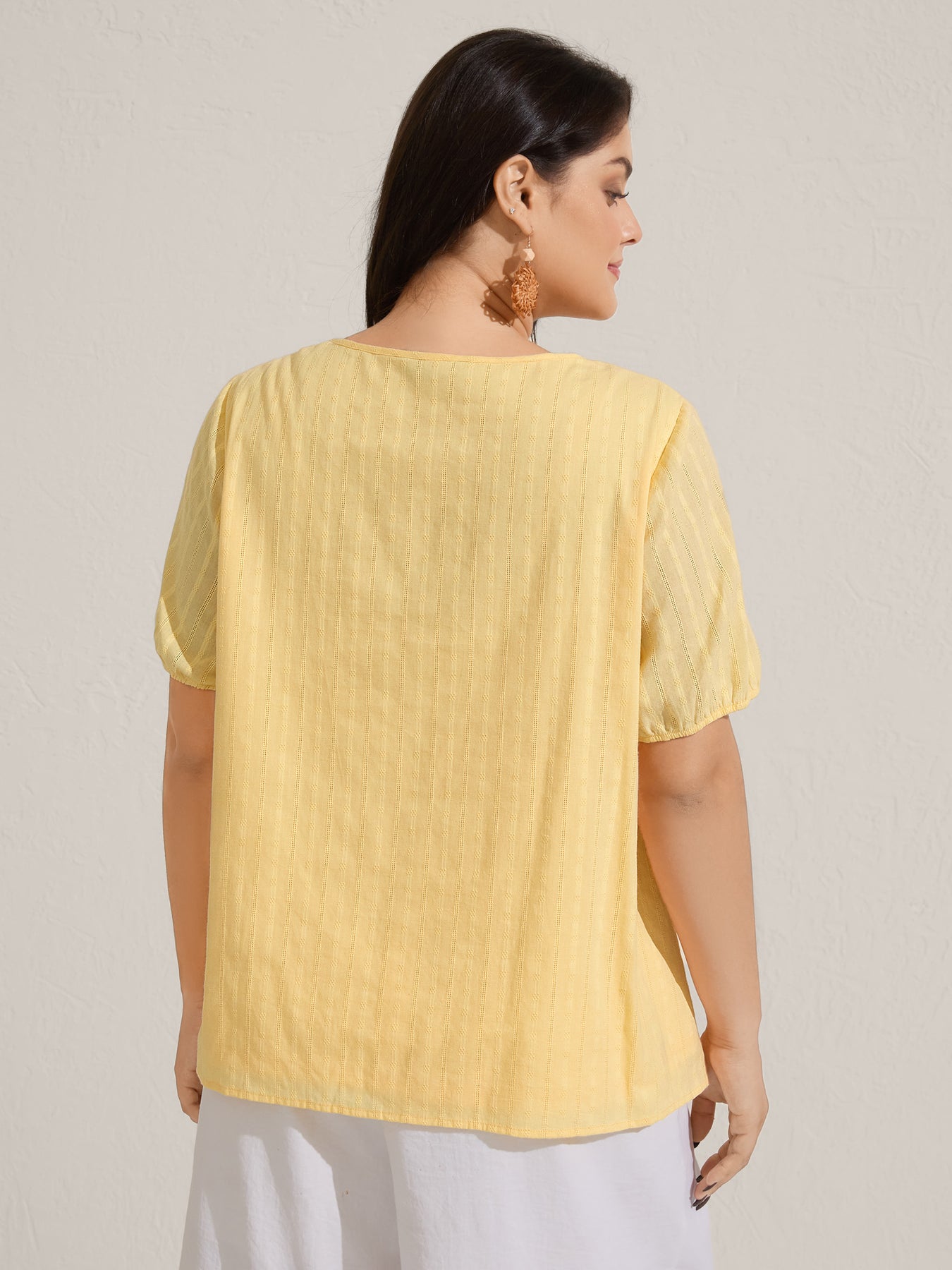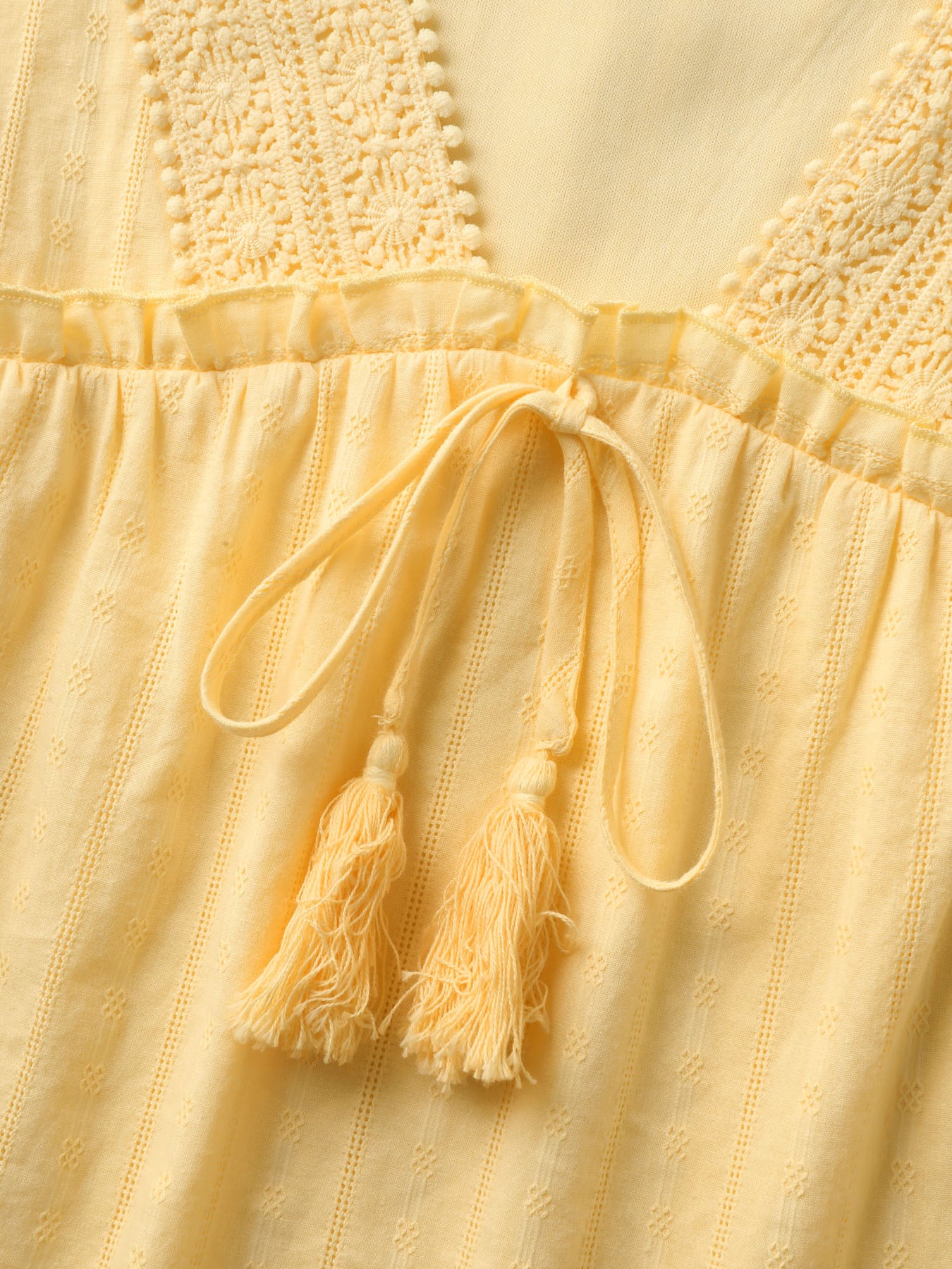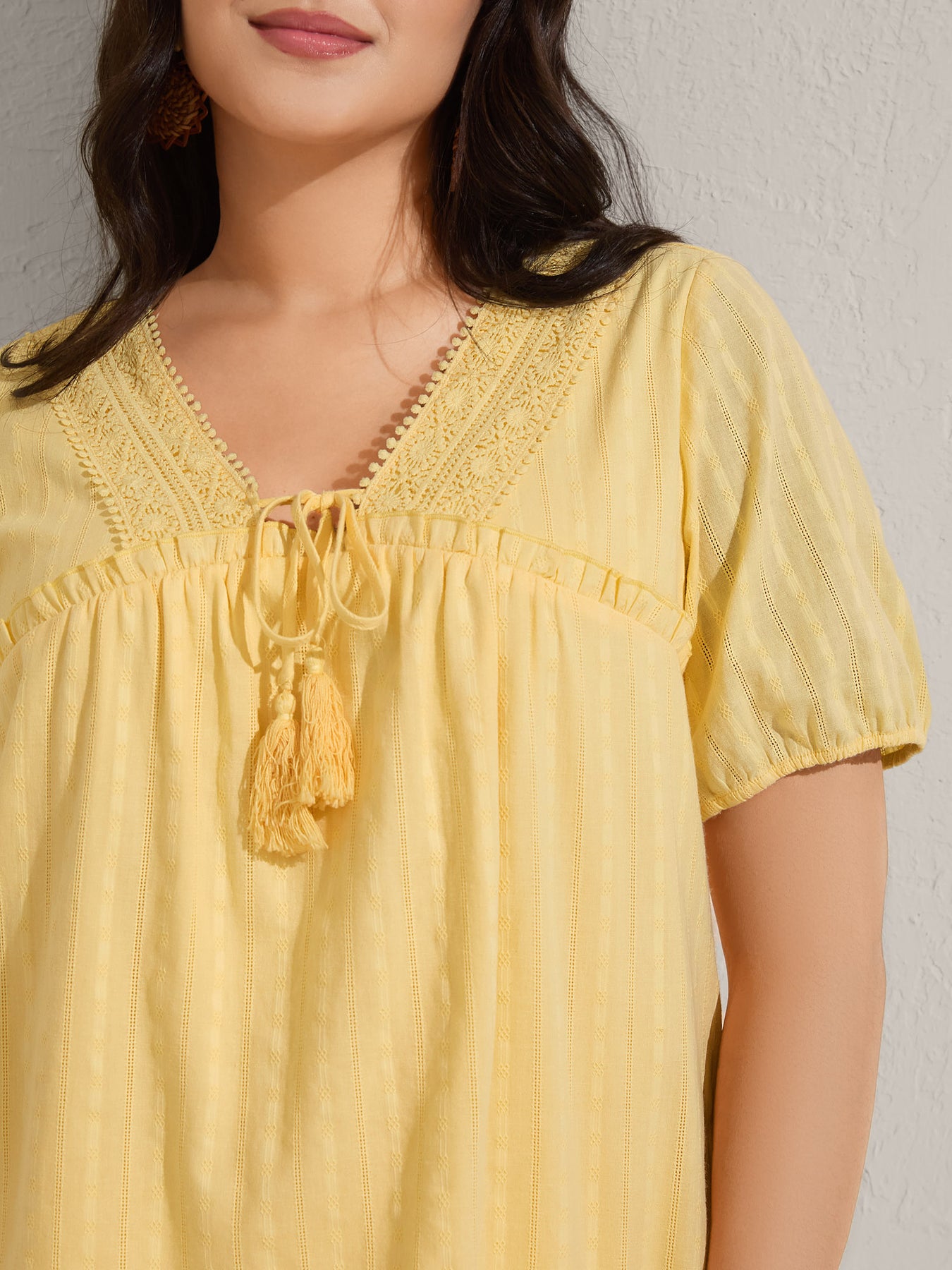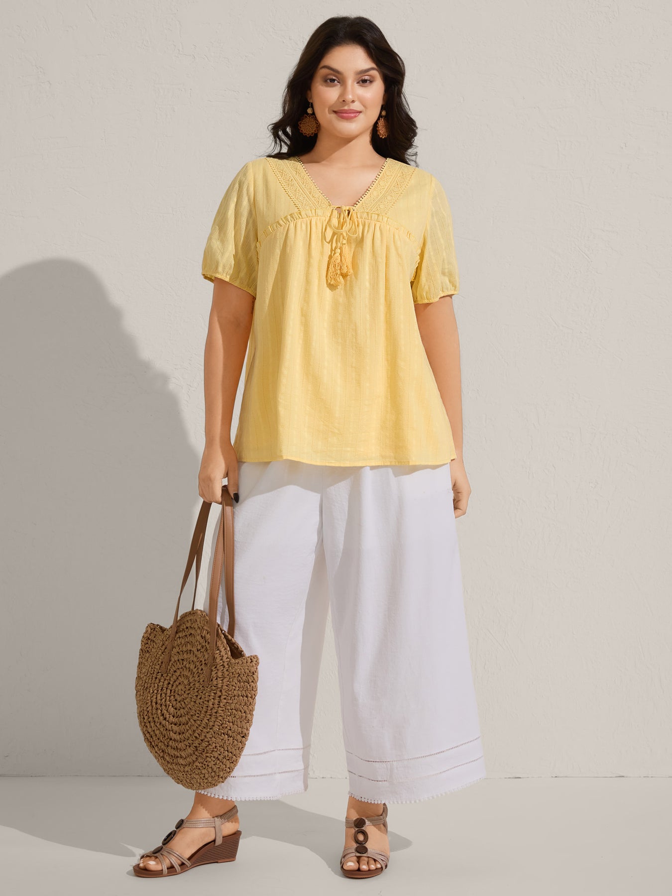 Cotton Textured Lace Trim Neck-Tie Blouse