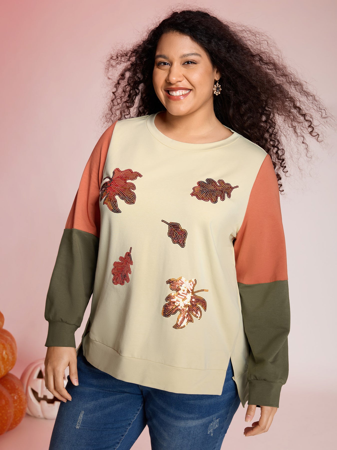 Crisp Leaf Print Sequin Embroidery Sweatshirt