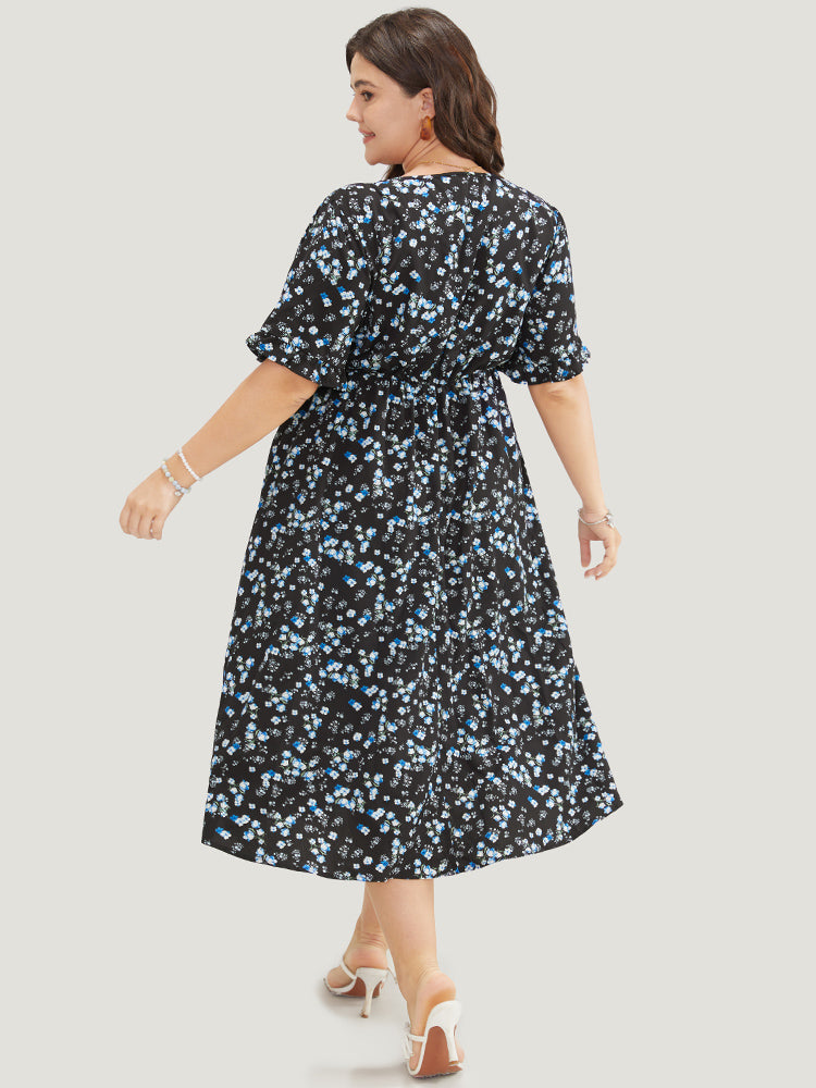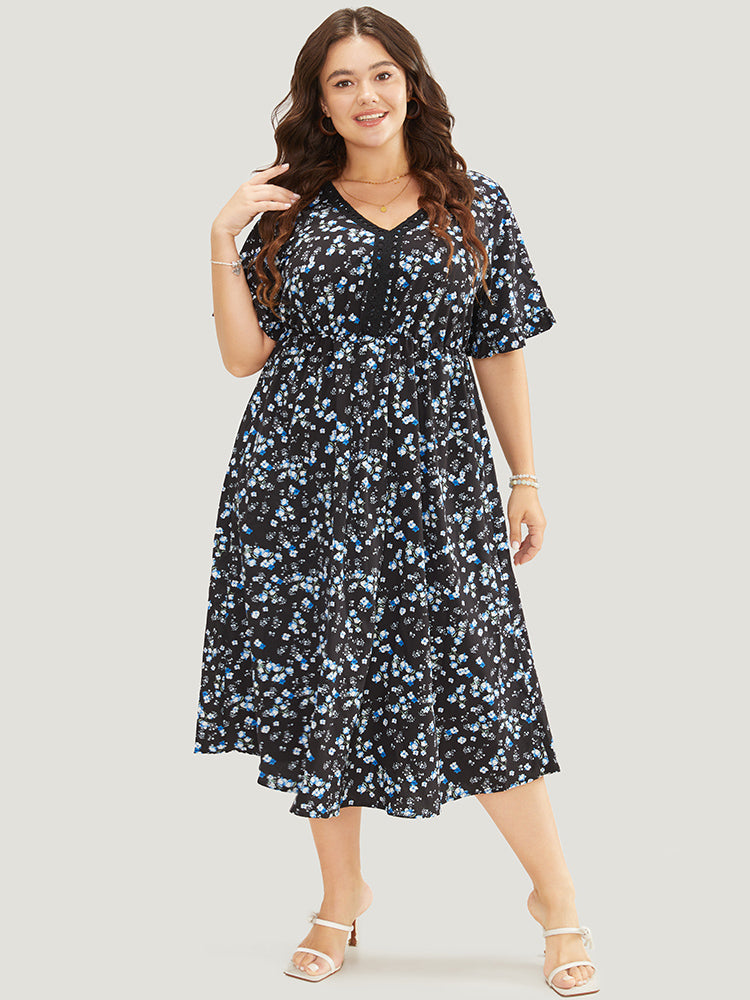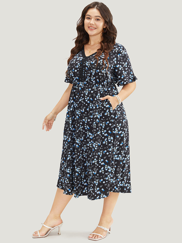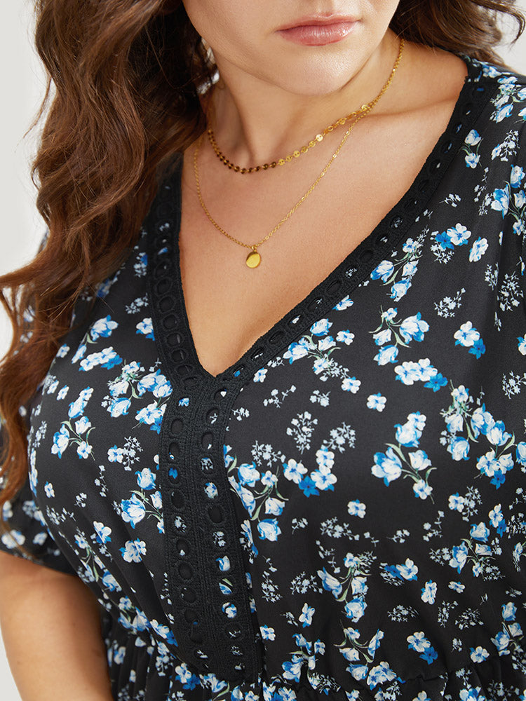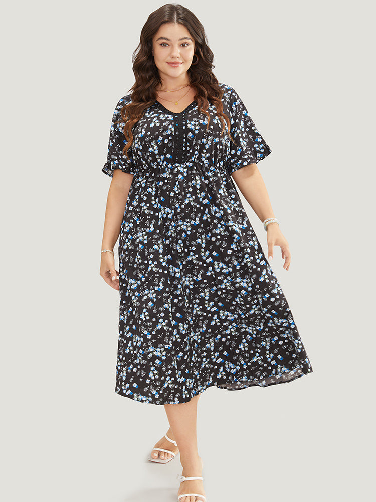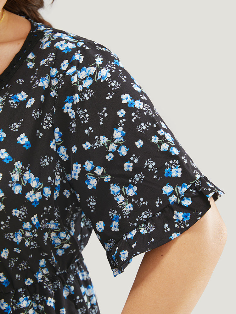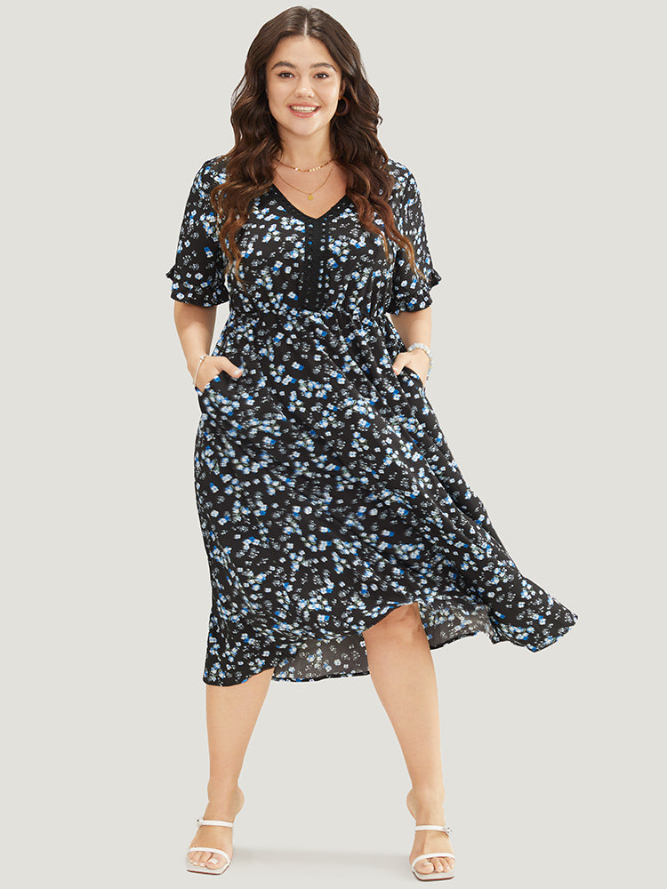 Ditsy Floral Dolman Sleeve Tassels Contrast Lace Pocket Split Dress