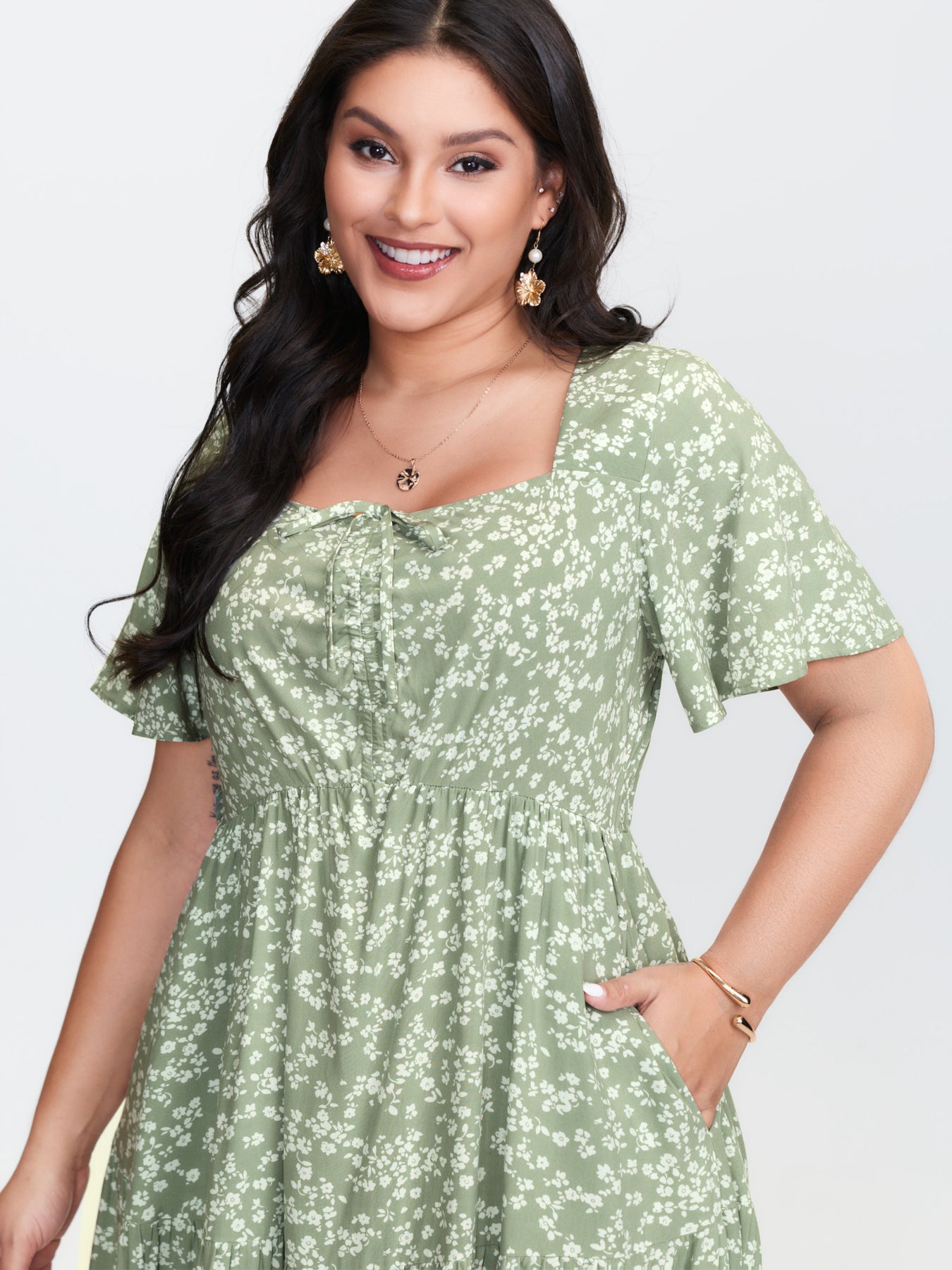 Ditsy Floral Sweetheart Drawstring Pocket Tiered Dress