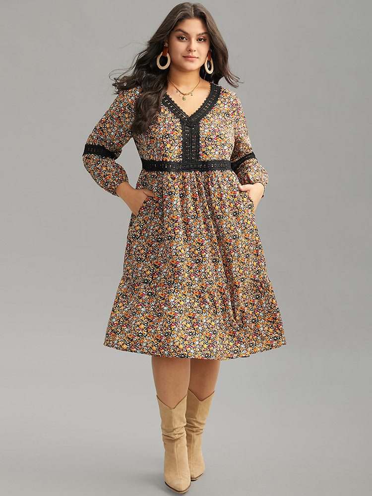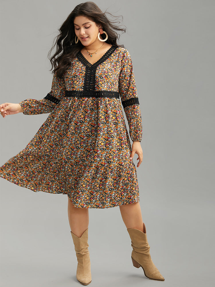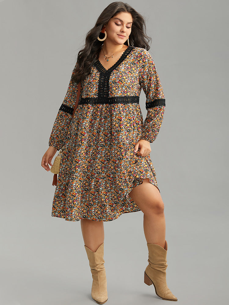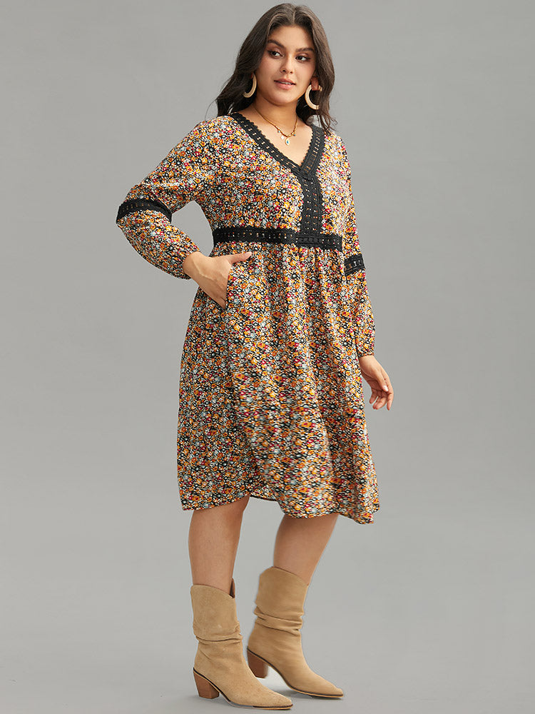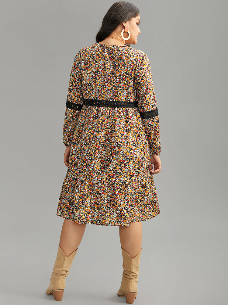 Ditsy Floral Lace Panel Lantern Sleeve Dress