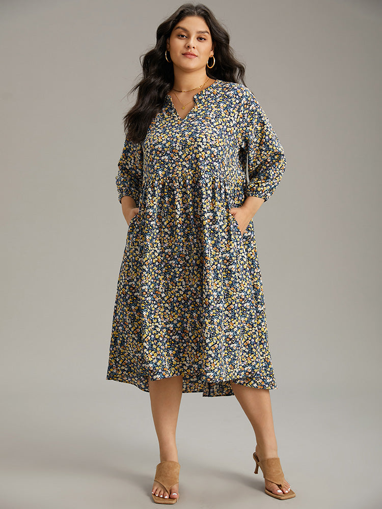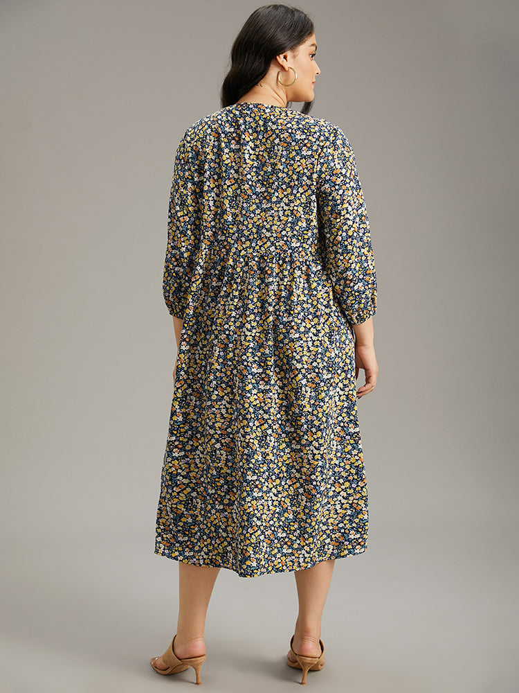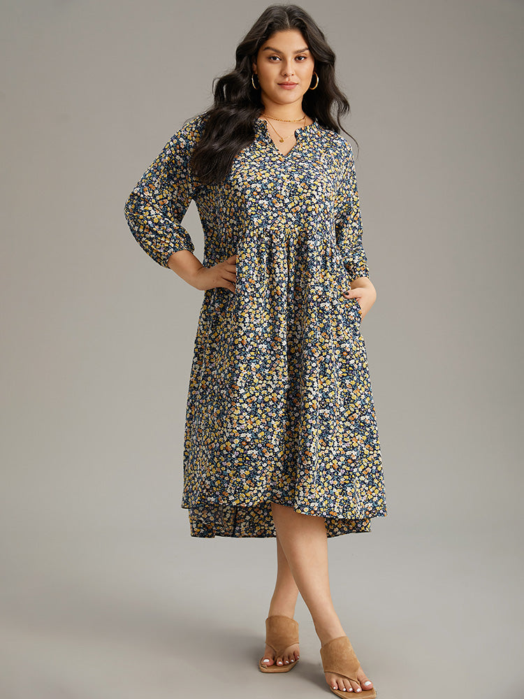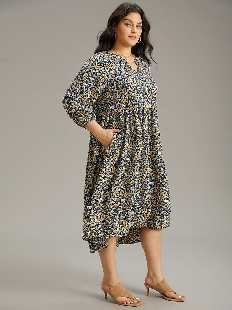Ditsy Floral Pocket Lantern Sleeve Ruffle Hem Dress