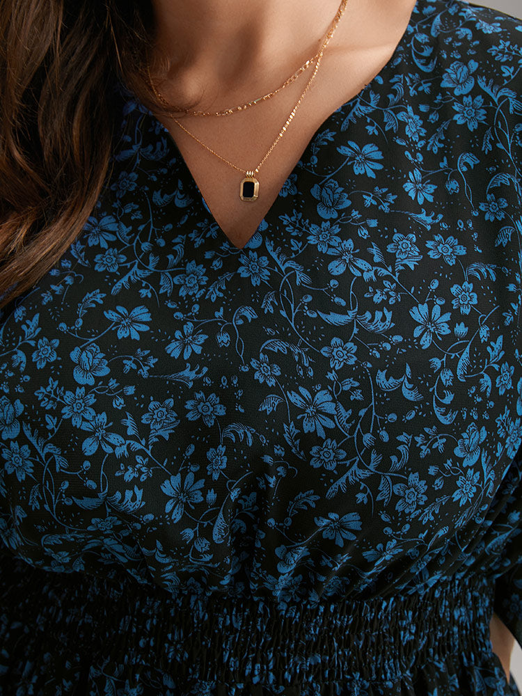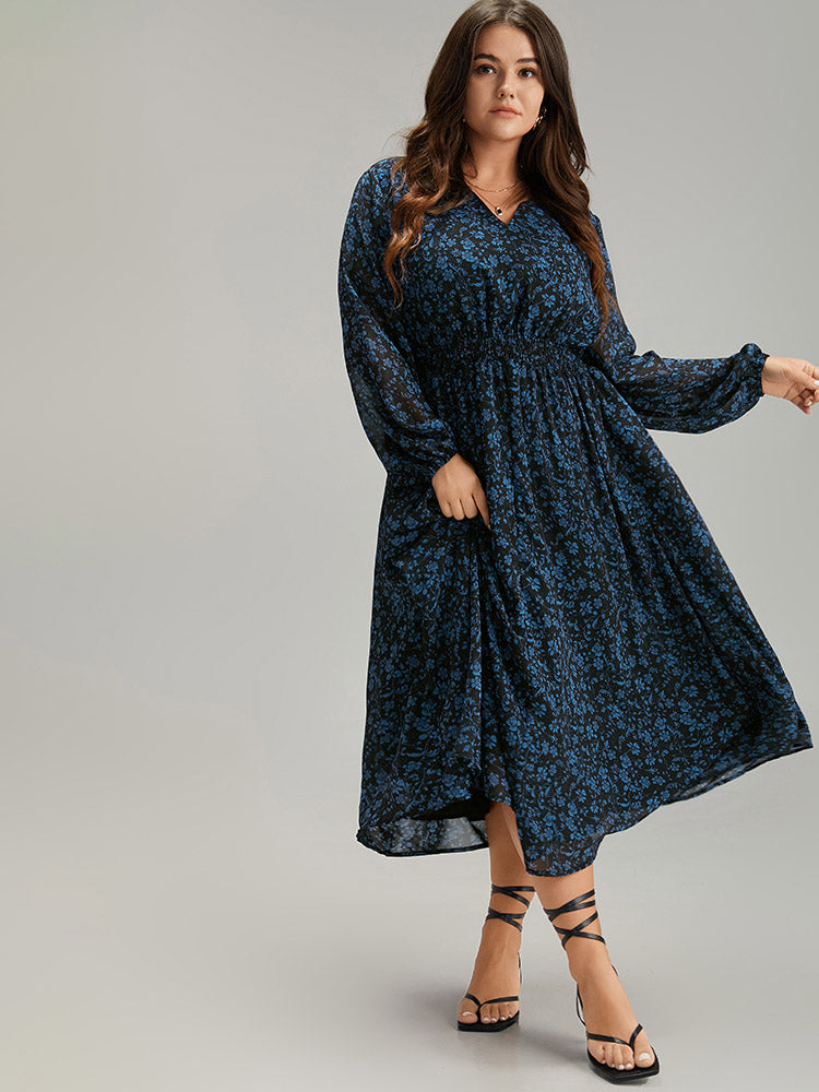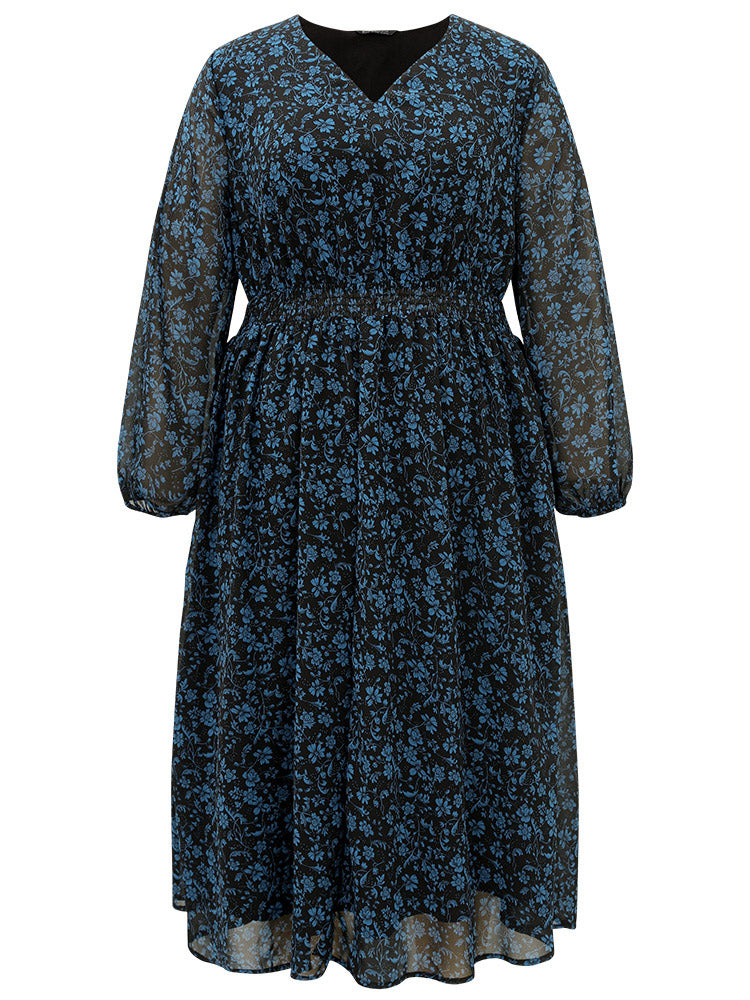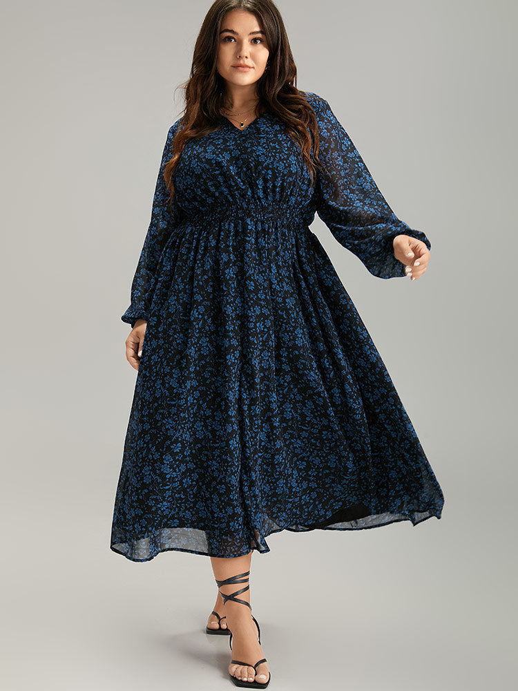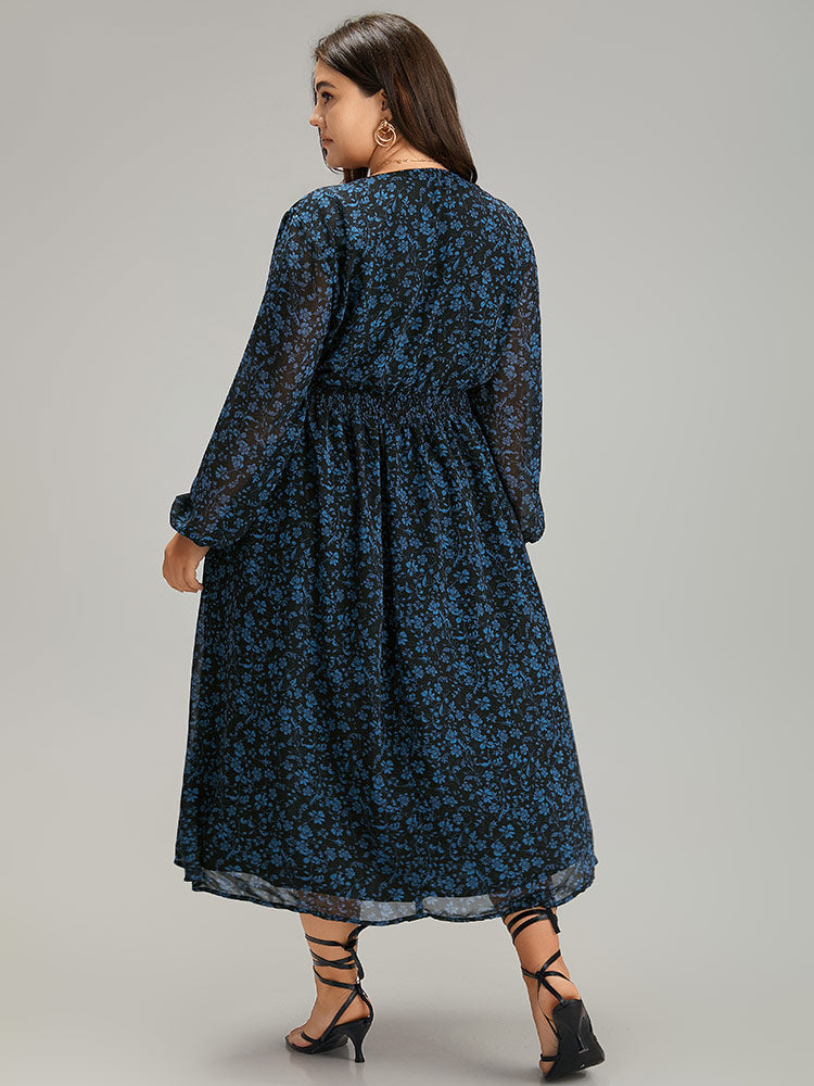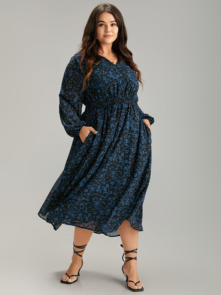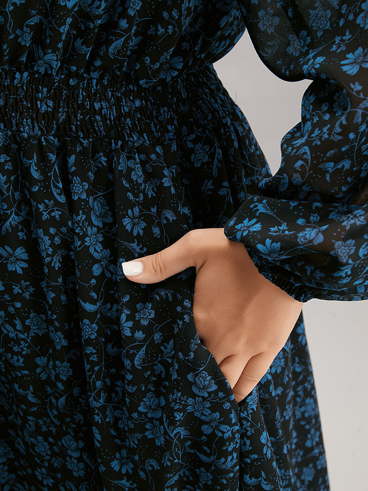 Chiffon Ditsy Floral Pocket Shirred Cuffs Dress