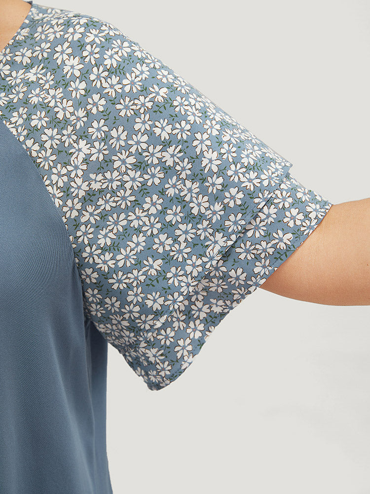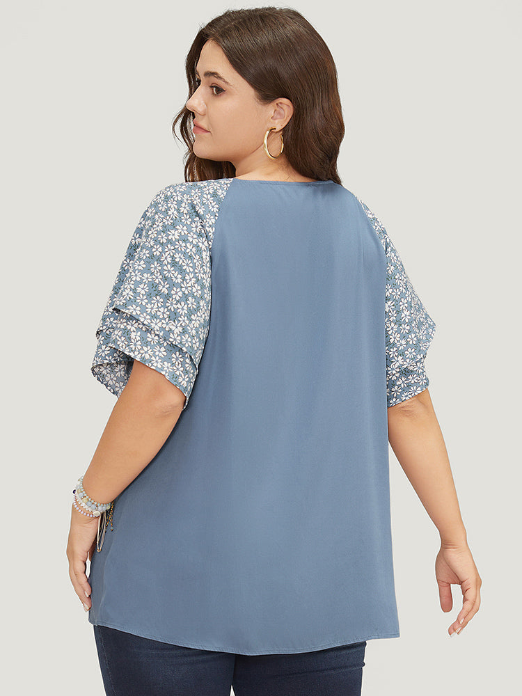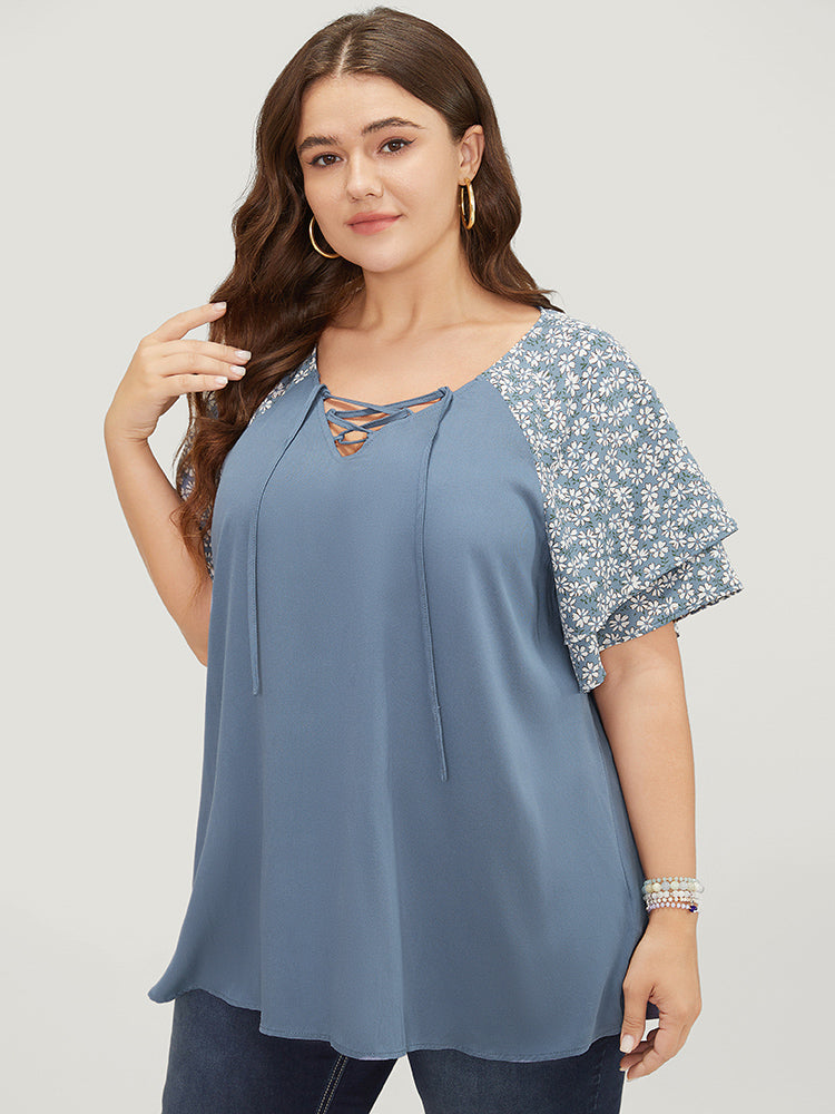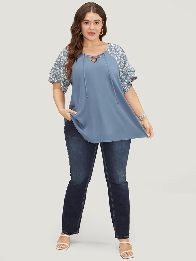 Ditsy Floral Raglan Sleeve Ruffle Tiered Lace Up Blouse