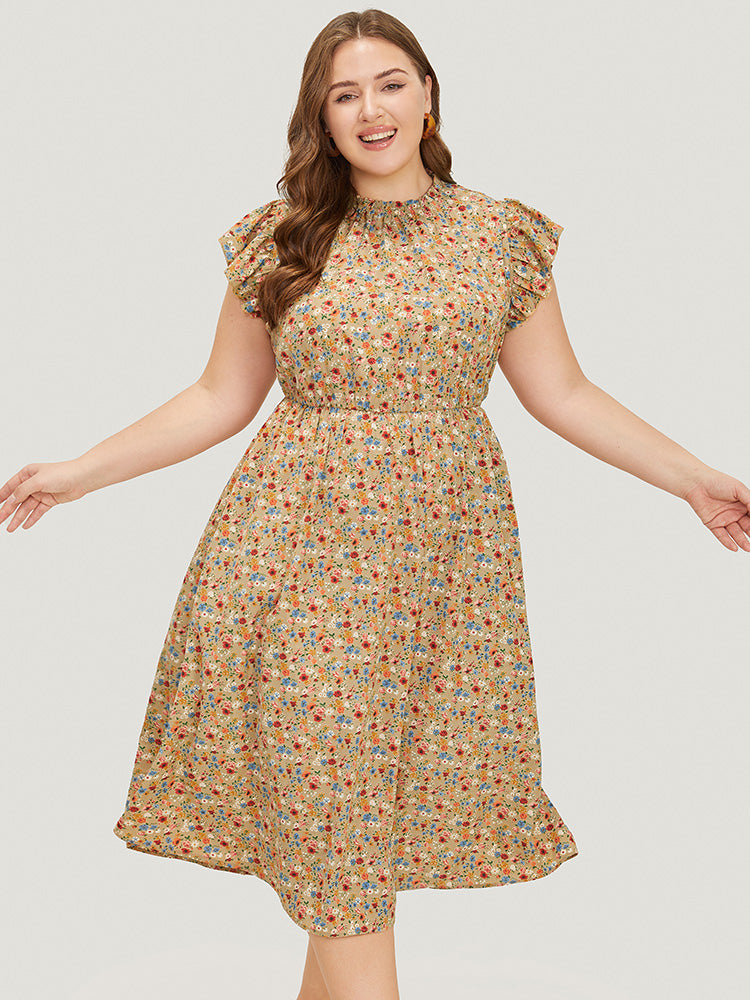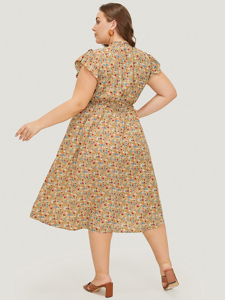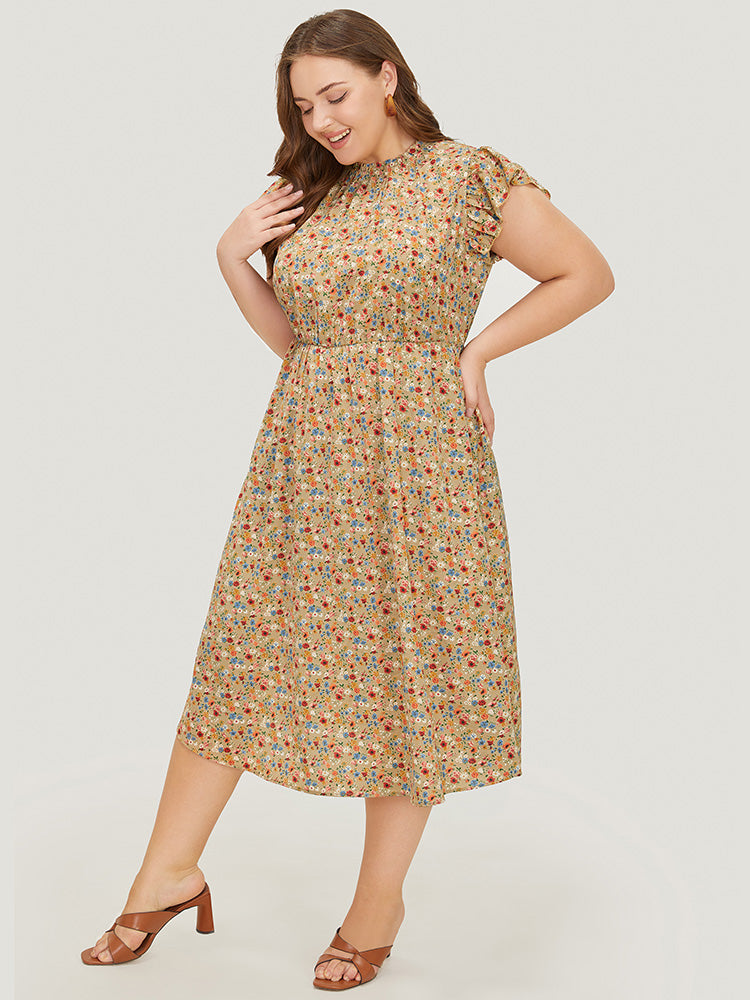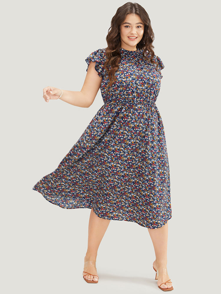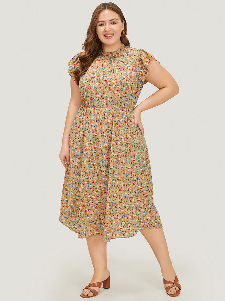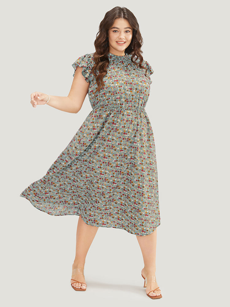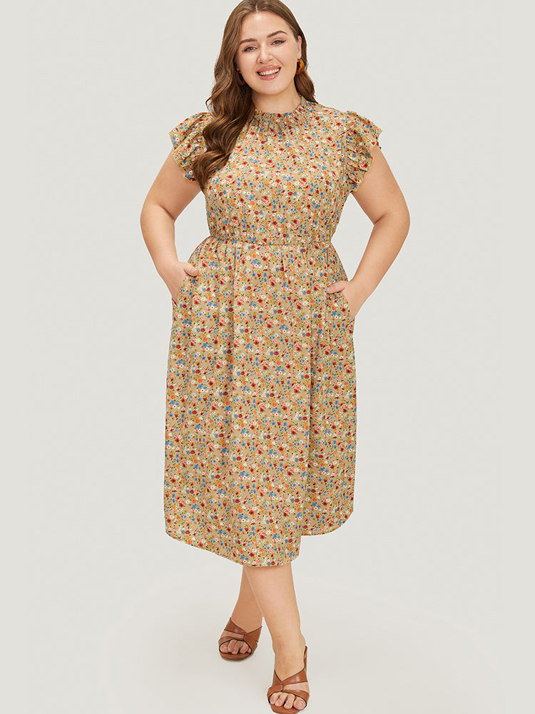 Ditsy Floral Ruffle Sleeve Pocket Frill Trim Mock Neck Dress