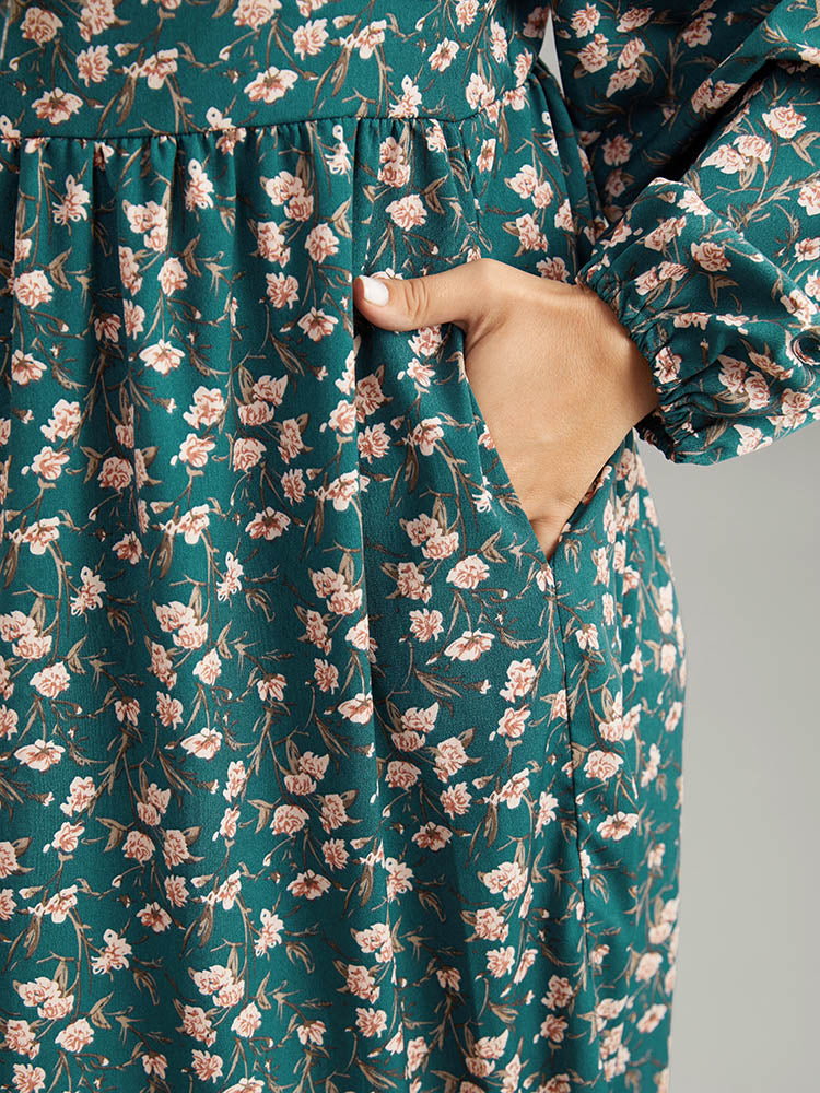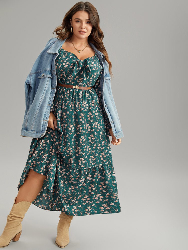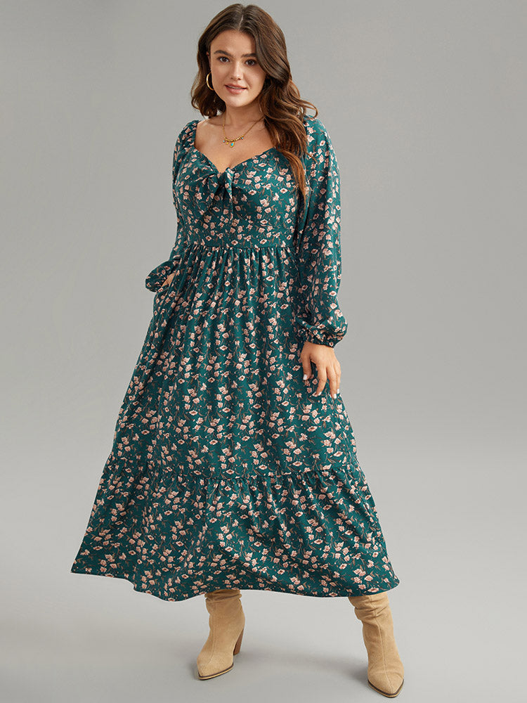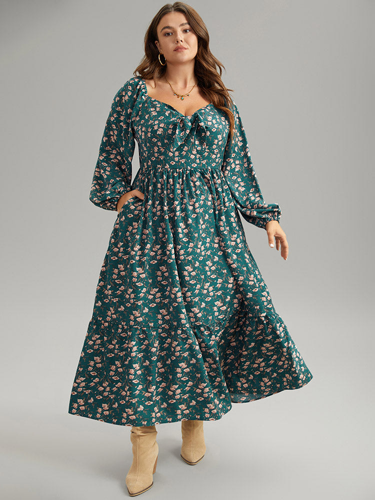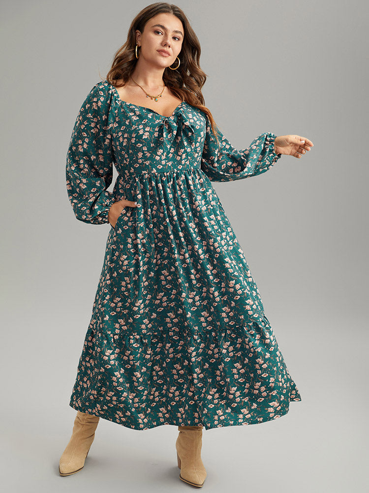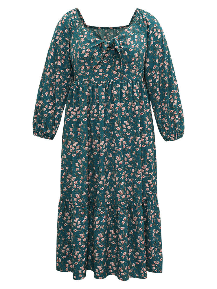 Ditsy Floral Square Neck Elastic Waist Ties Dress