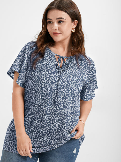 Ditsy Floral Tie Neck Flutter Sleeve Blouse
