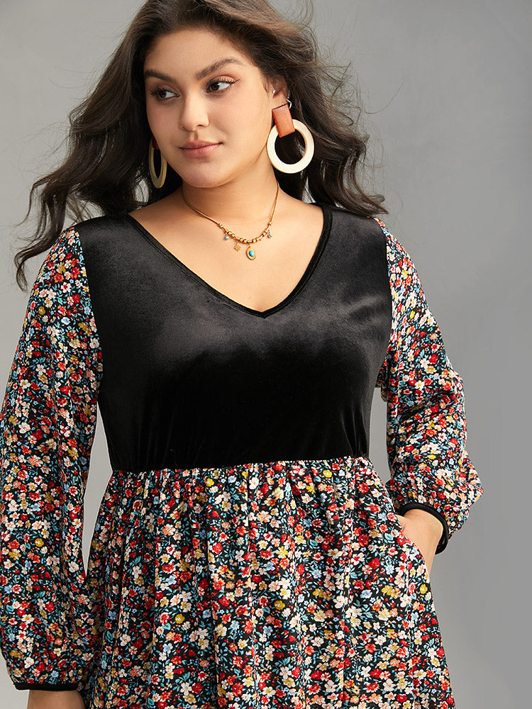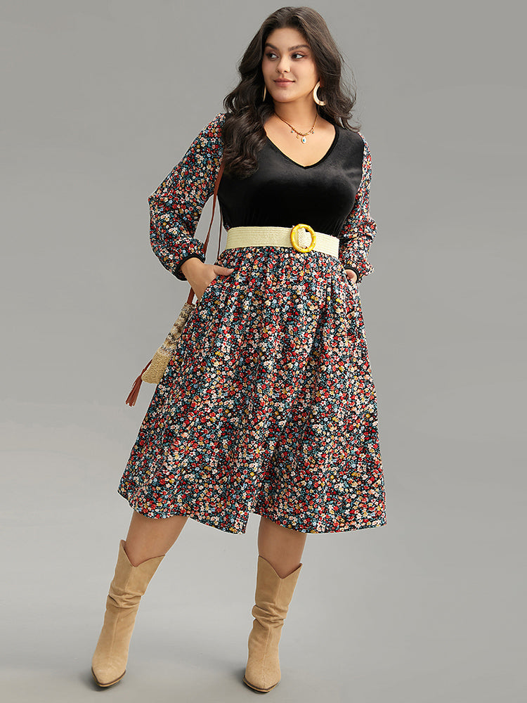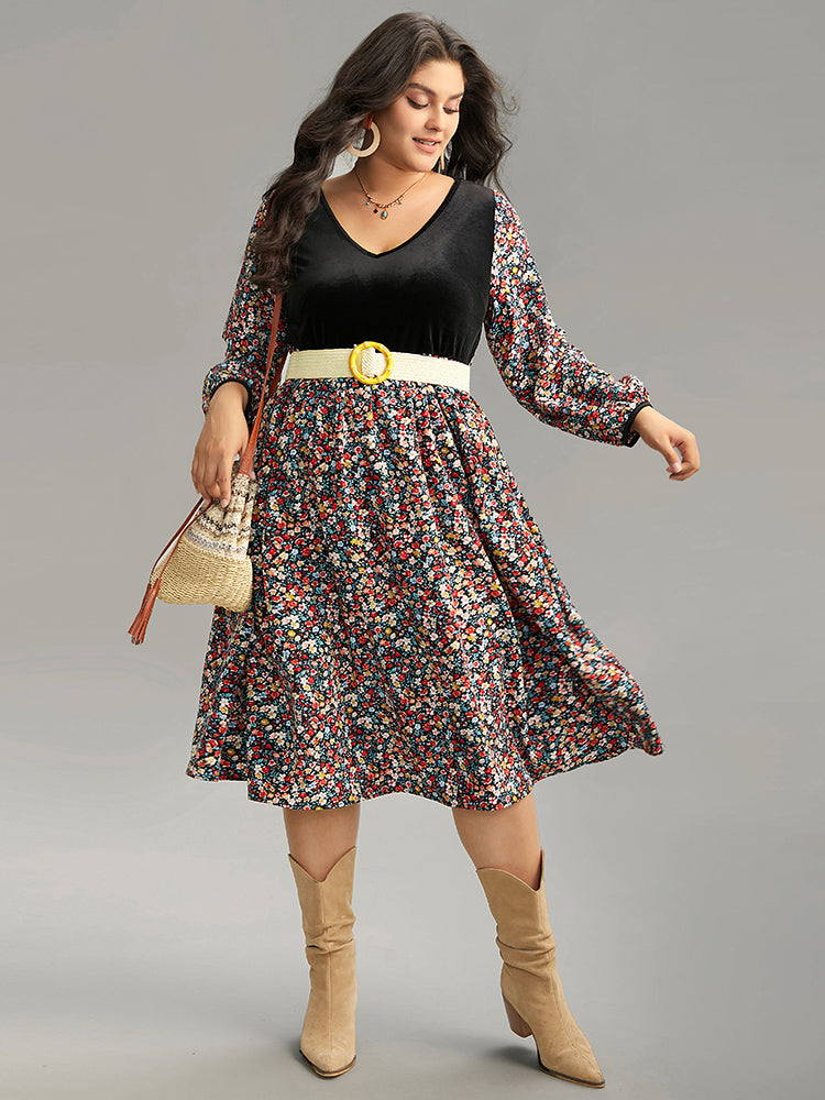 Ditsy Floral Velvet Patchwork Lantern Sleeve Dress