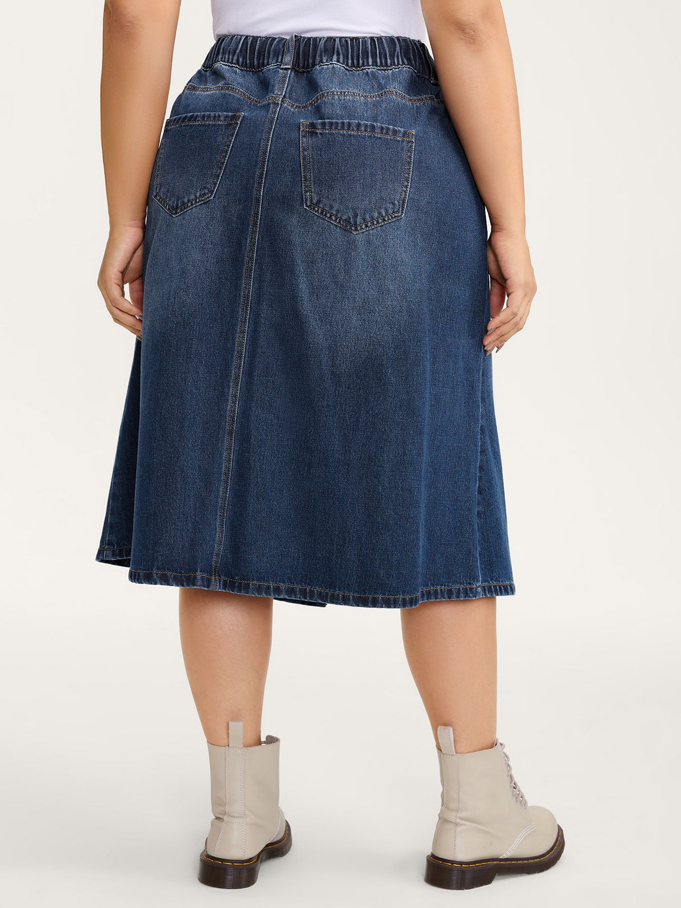 Drawstring Front Slit Stretchy Waist Midi Denim Skirt